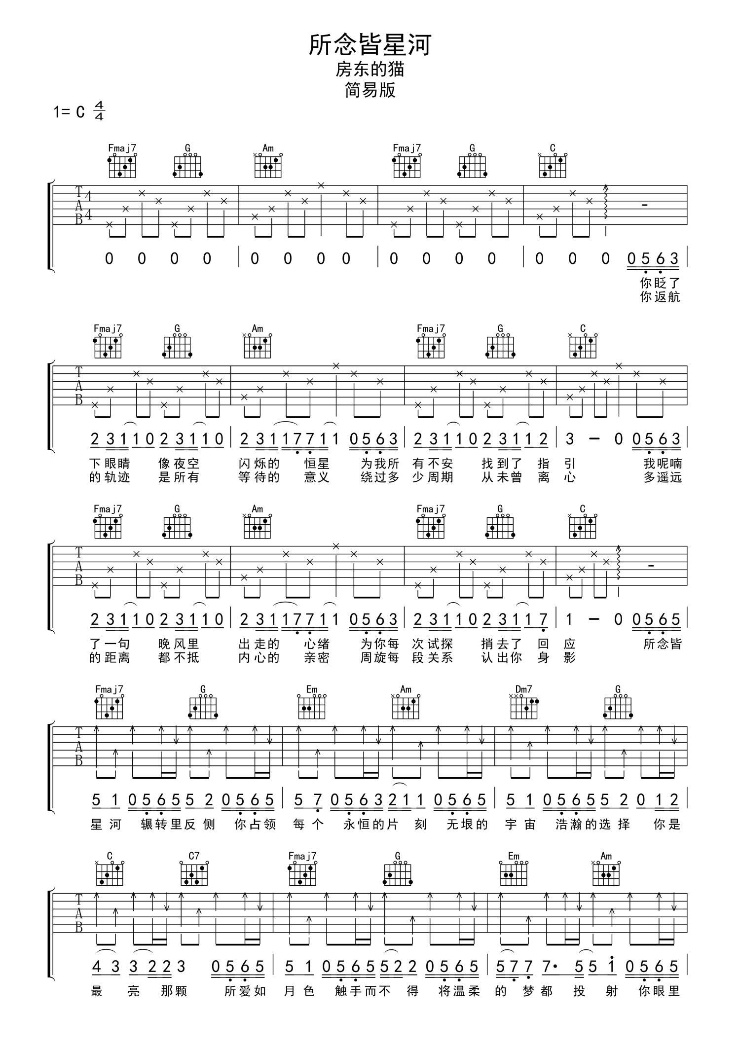 曲谱介绍: 房东的猫《所念皆星河》吉他谱_C调吉他弹唱谱_简易版