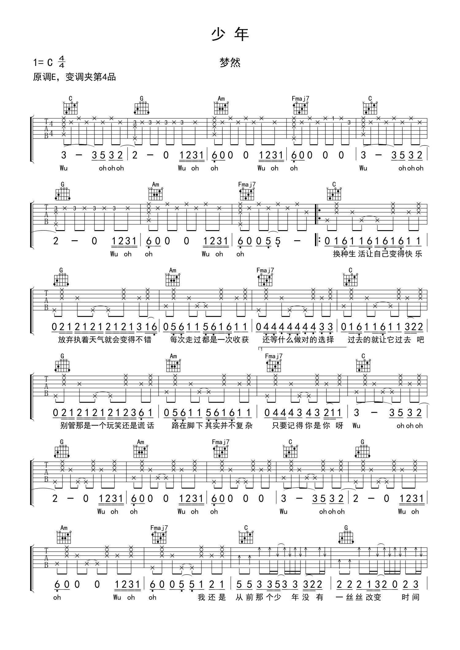 曲谱介绍: 梦然《少年》吉他谱_C调吉他弹唱谱