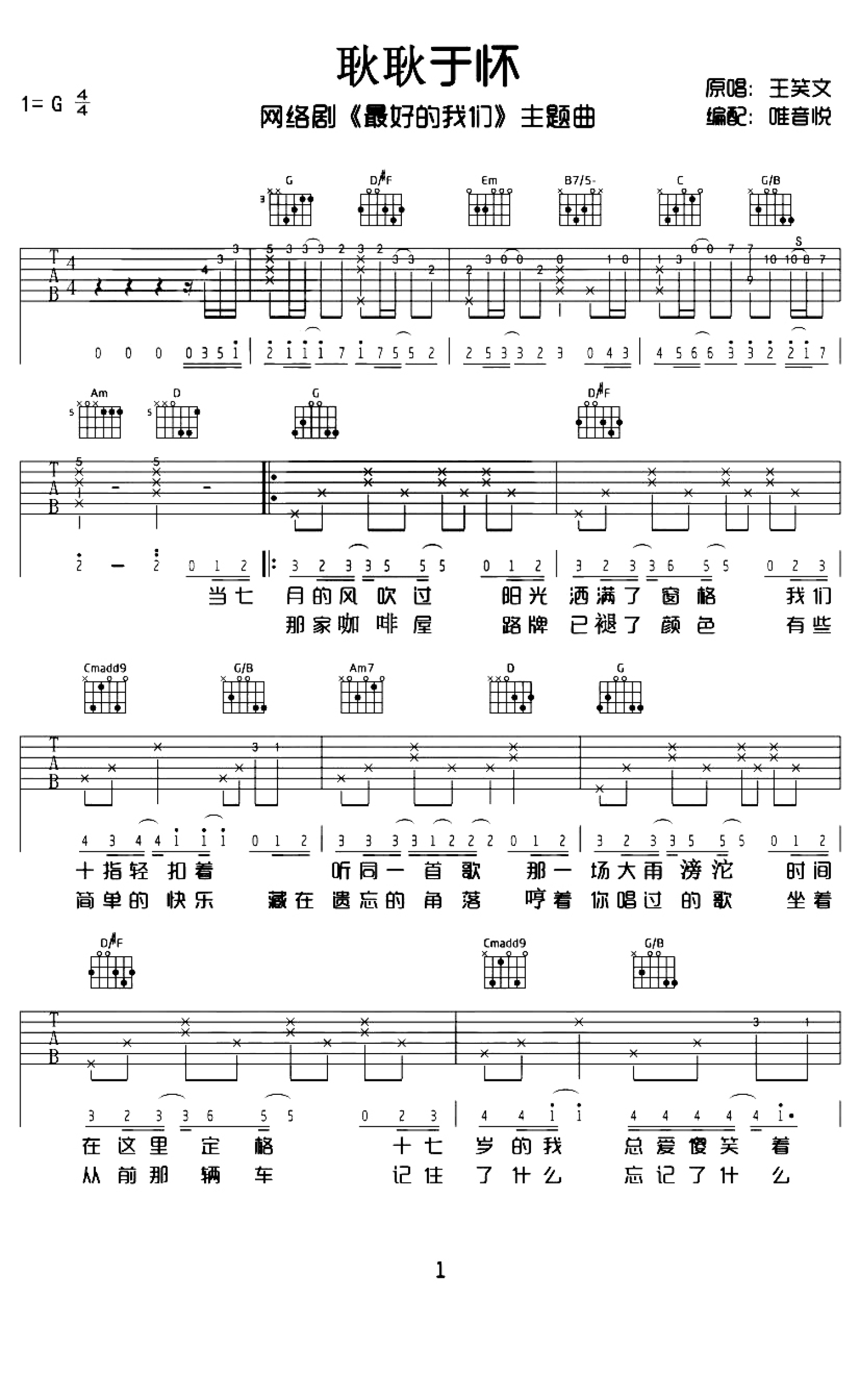 曲谱介绍: 耿耿于怀吉他谱,G调指法编配,王笑文为热播的青春校园网络剧《最好的我们》演唱的主题曲,曾经的高中时代,那穿着蓝色校服的少年,那都经历过的青春;那些年的同桌,那些年的闺蜜,那些年的卷子那年的高考,就像歌里唱的,总有一个人,是你耿耿于怀的青春。