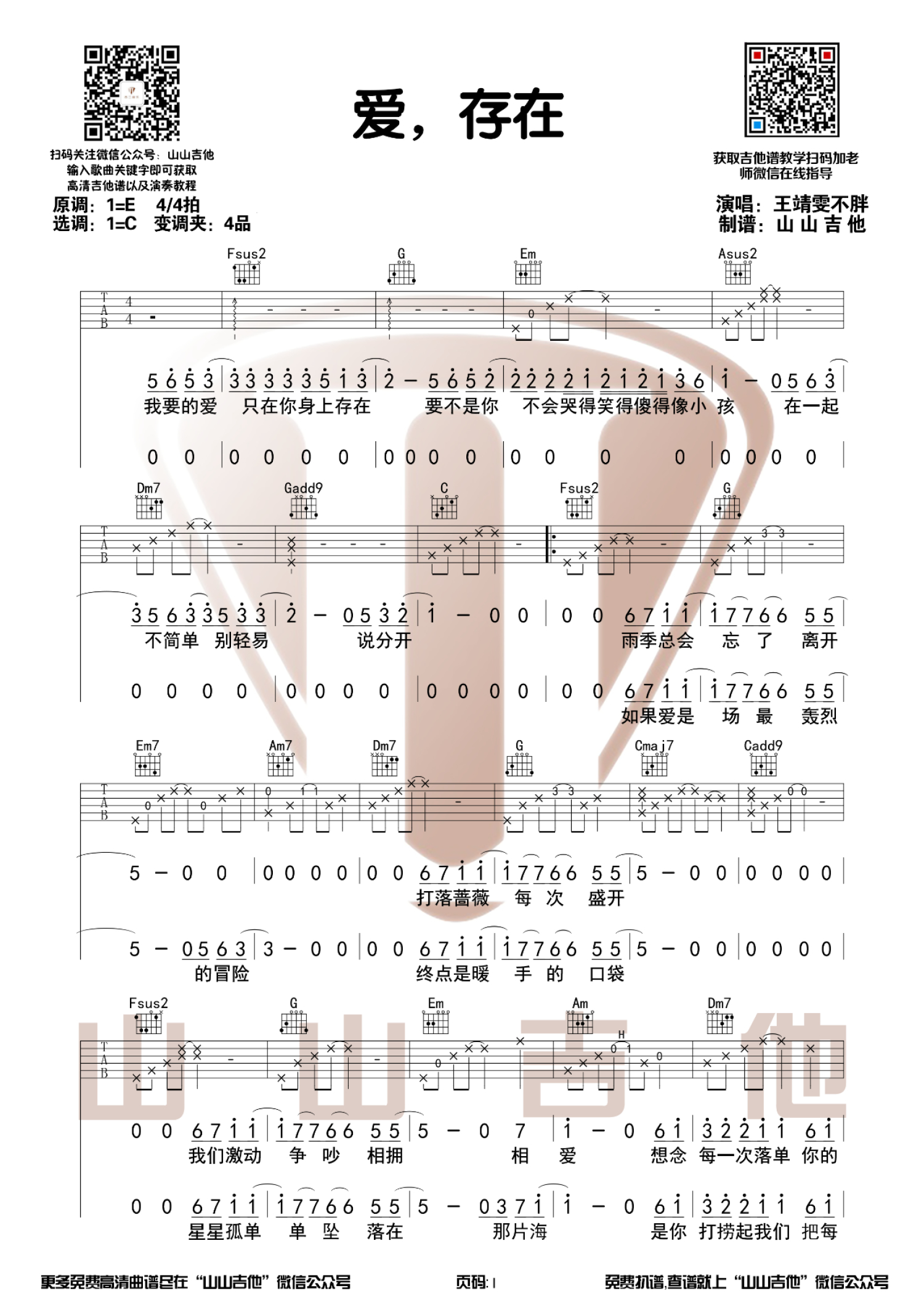爱,存在吉他谱 - 王靖雯不胖 - C调吉他弹唱谱