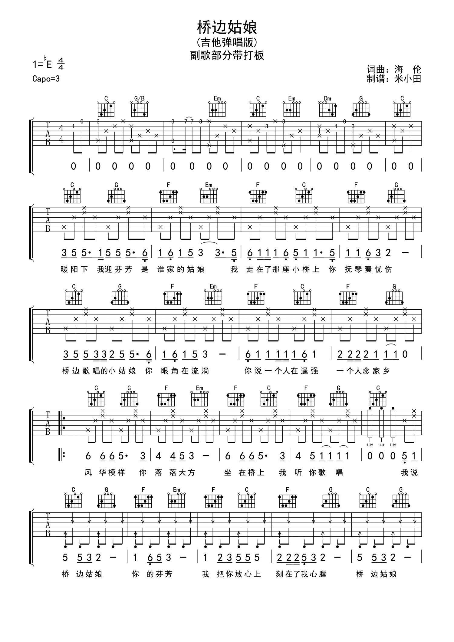 曲谱介绍: 海伦《桥边姑娘》吉他谱_C调吉他弹唱谱_副歌带打板