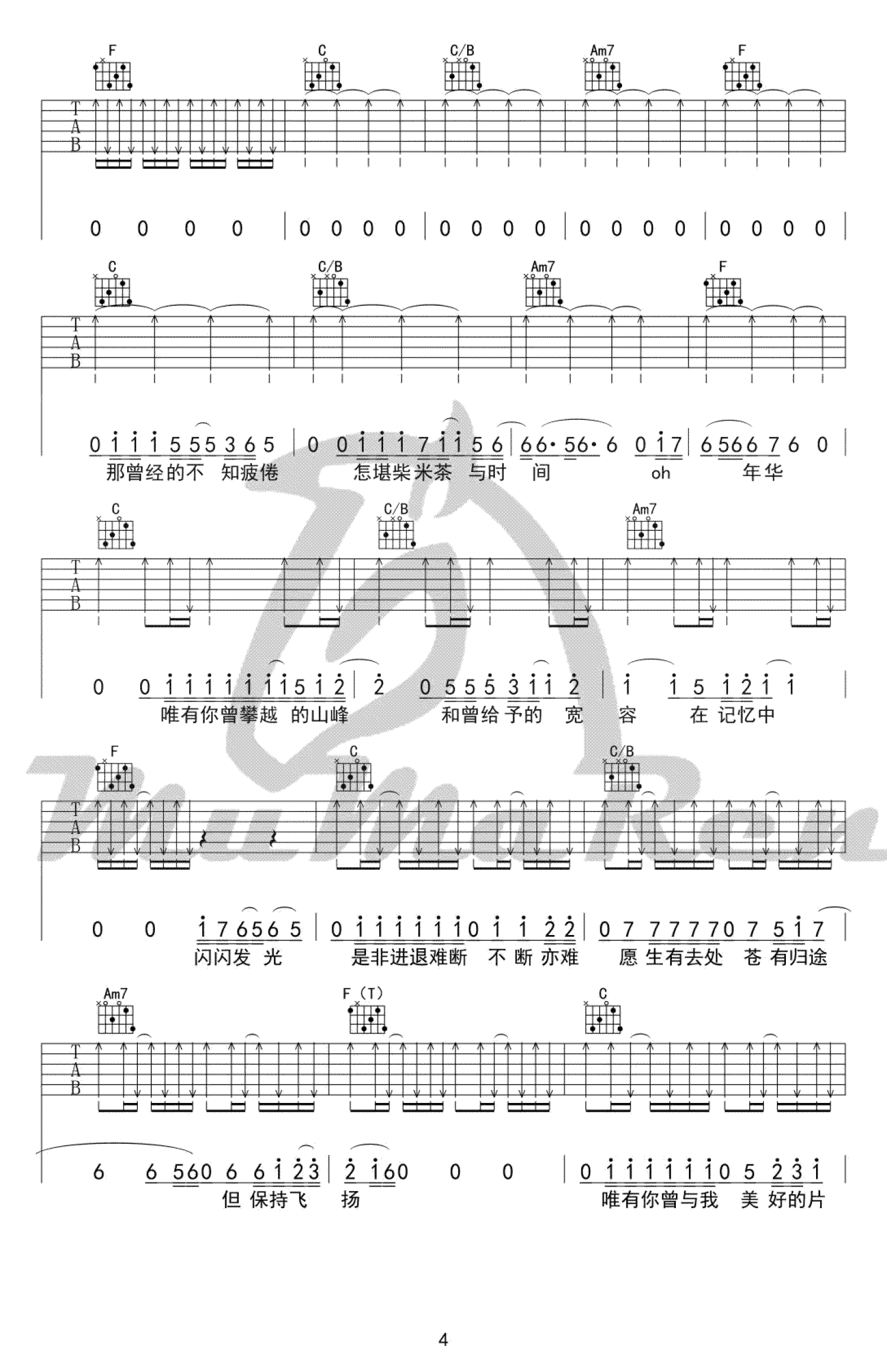 曲谱介绍: 变调夹夹4品,旋律飞扬,轻轻击打那颗积满灰尘的心,既然什么都会褪色,不如保持飞扬,唯有你曾与我美好的片段最闪光。吉他弹唱演示视频: