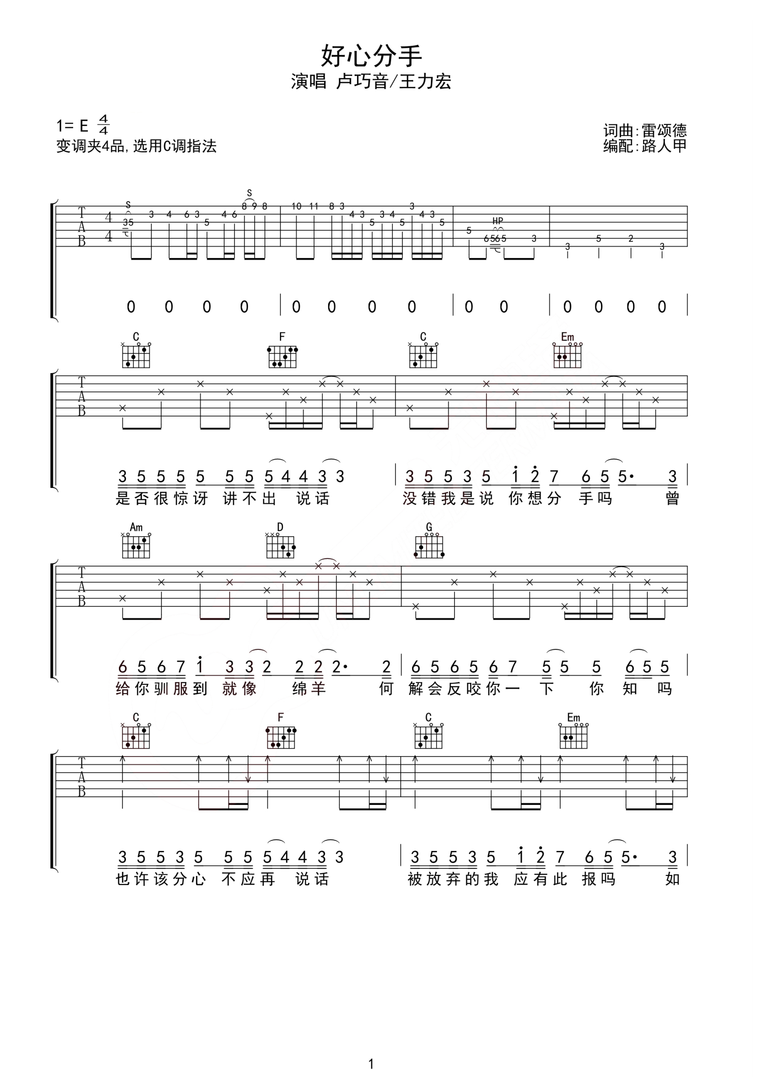 曲谱介绍: 卢巧音/王力宏《好心分手》吉他谱_C调吉他弹唱谱