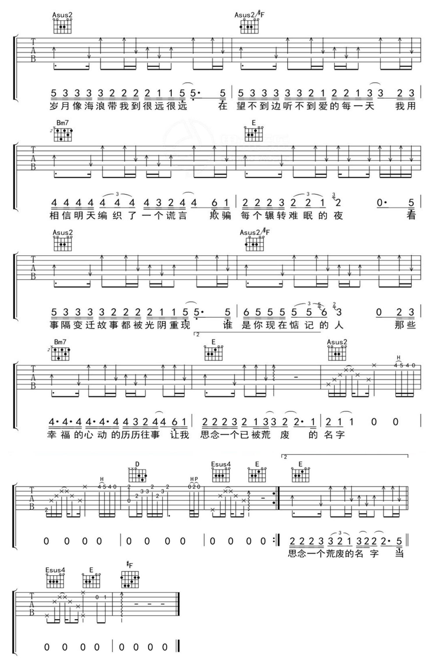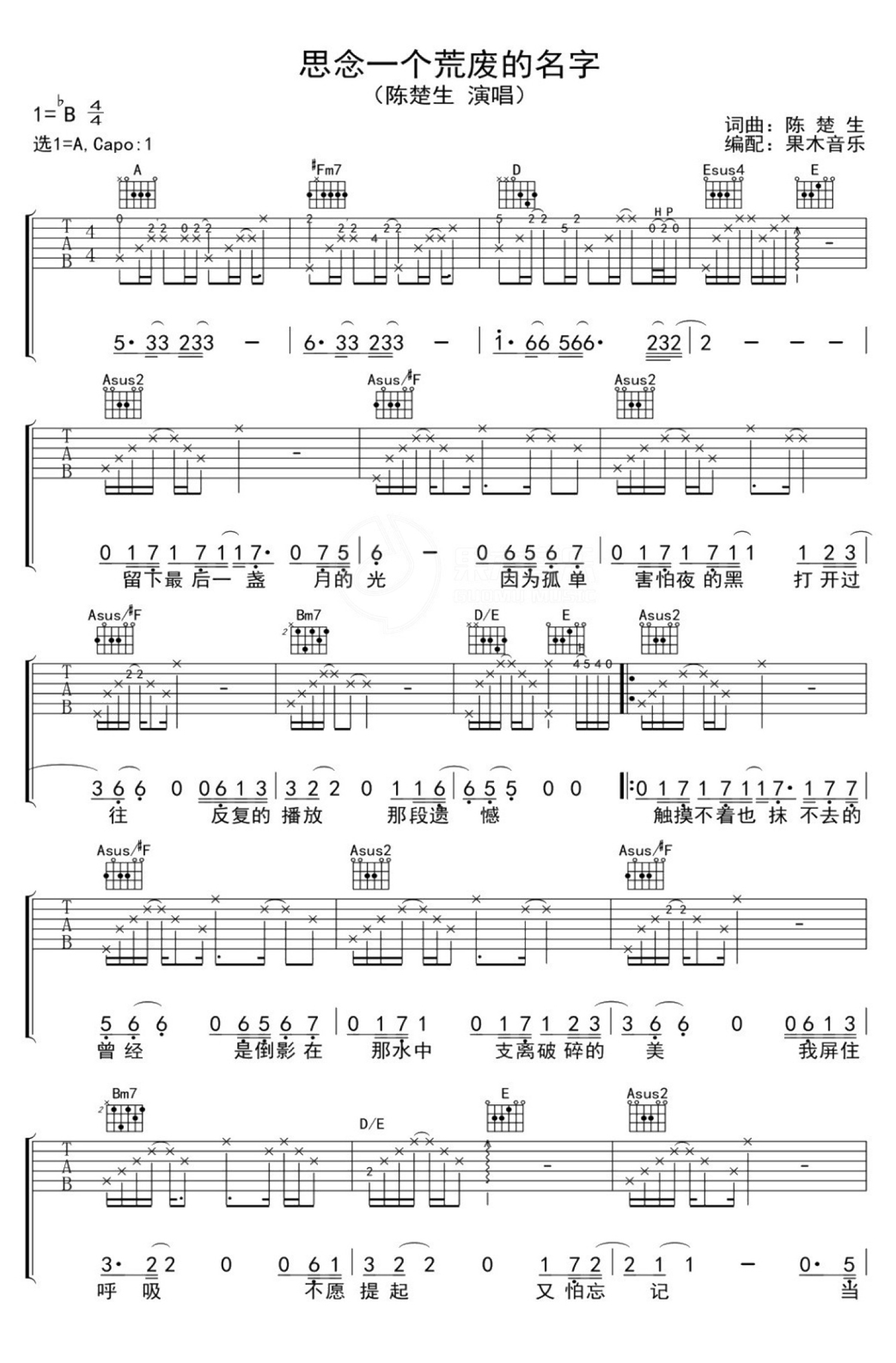 曲谱介绍: 陈楚生《思念一个荒废的名字》吉他谱_A调吉他弹唱谱