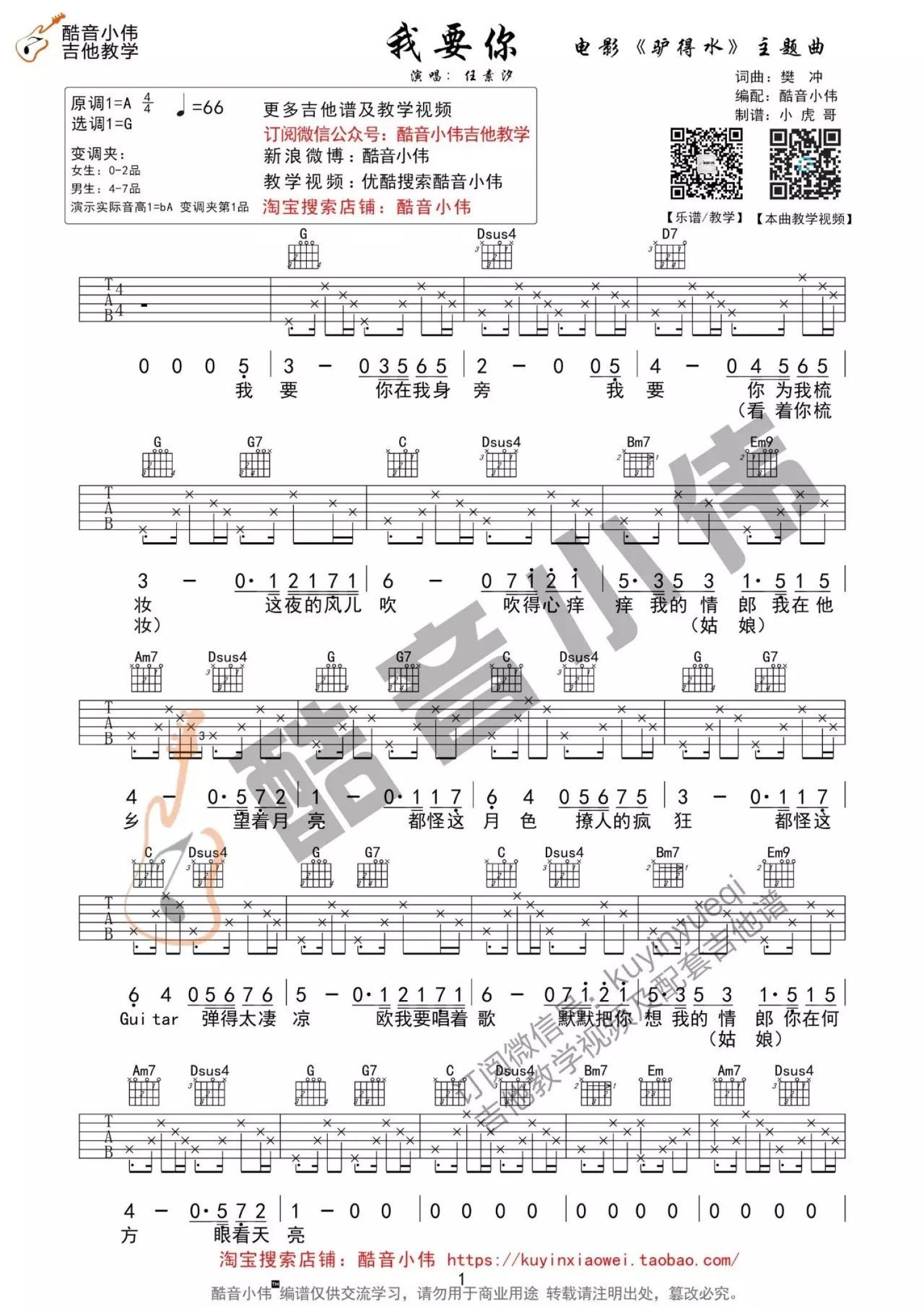 曲谱介绍: 《我要你》,这首歌有几个不同的翻唱版本,但还是以任素汐的演唱最能令人动心。歌曲充满了复古的色彩,干净却沁人心脾的旋律,伴随着悠扬的吉他伴奏,任素汐婉转讲述了一个“温柔”又“炎凉”的故事。《我要你》吉他弹唱视频演示&教学来自酷音小伟编配分享《我要你》吉他谱,G调原版编配六线谱,附弹唱演示和教学,整首歌的伴奏并不难,只要把节拍及和弦的转换练好,就能轻松拿下了。