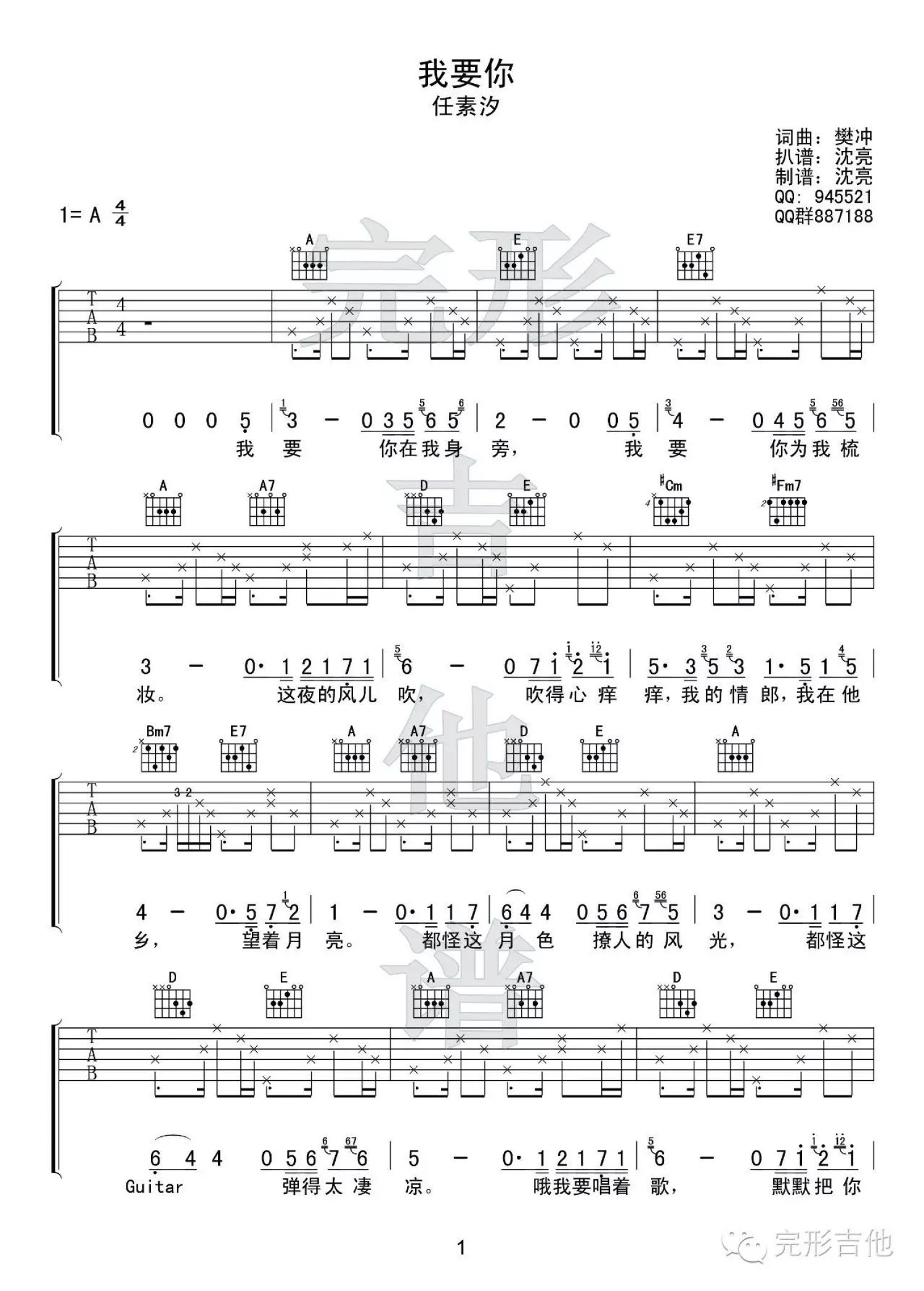 我要你吉他谱 - 任素汐/樊冲 - A调吉他弹唱谱 - 原版编配