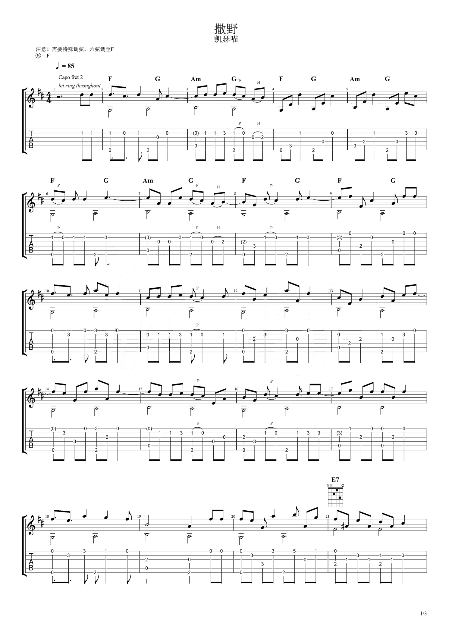 曲谱介绍: 凯瑟喵《撒野》吉他谱_吉他独奏谱