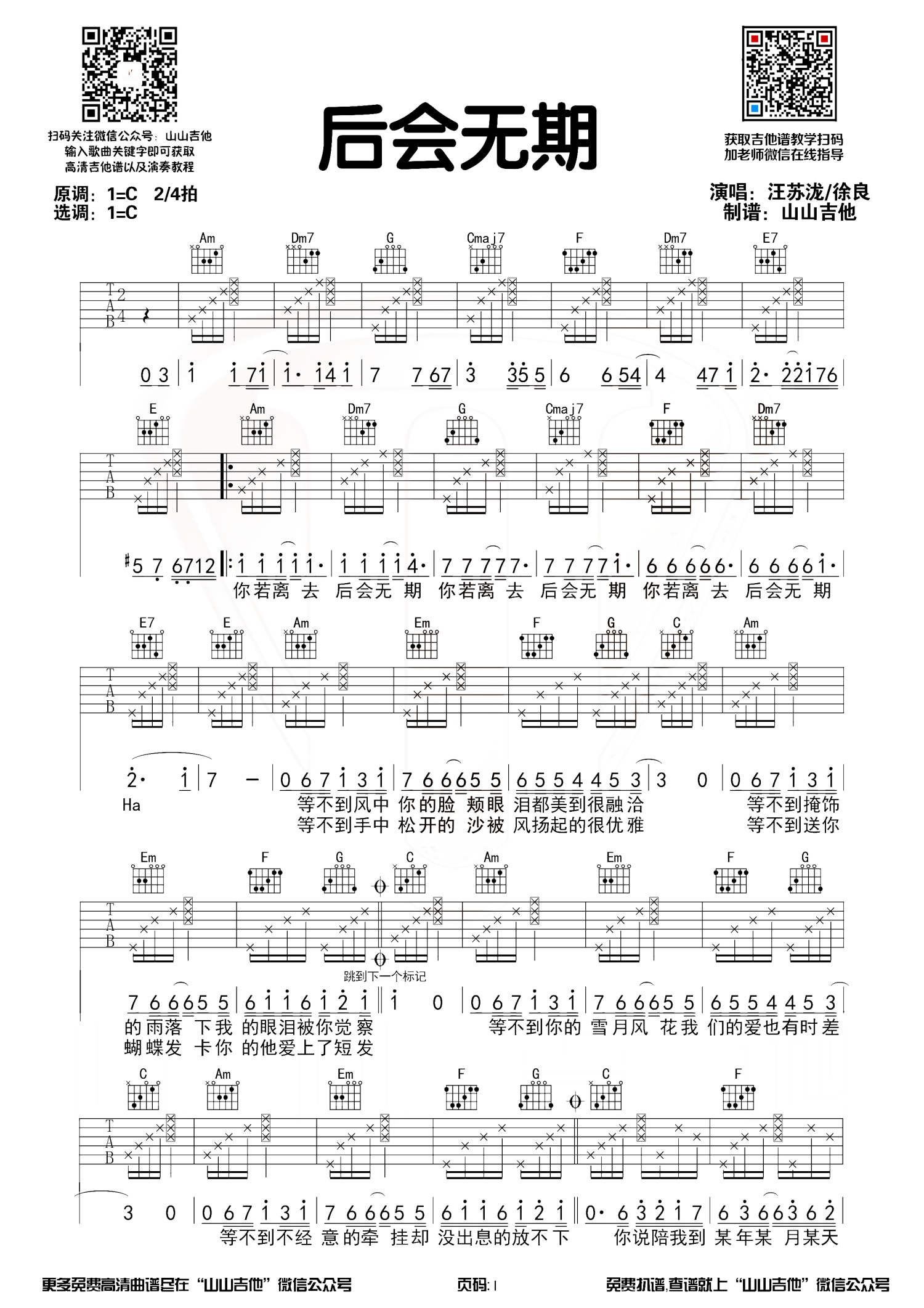曲谱介绍: 汪苏泷《后会无期》吉他谱_C调吉他弹唱谱