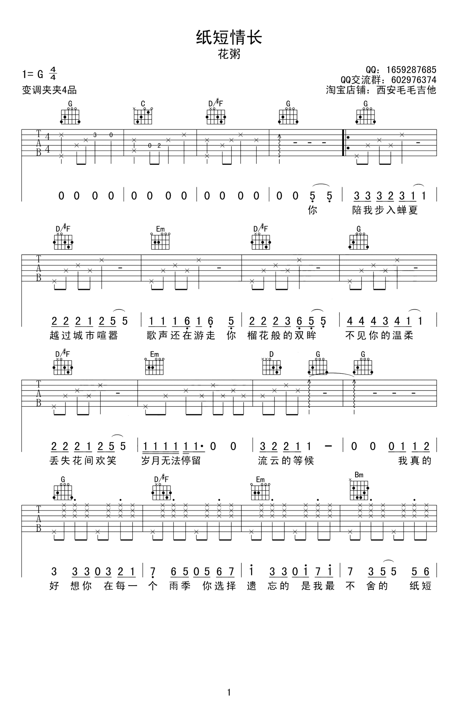 曲谱介绍: 花粥《纸短情长》吉他谱_G调吉他弹唱谱