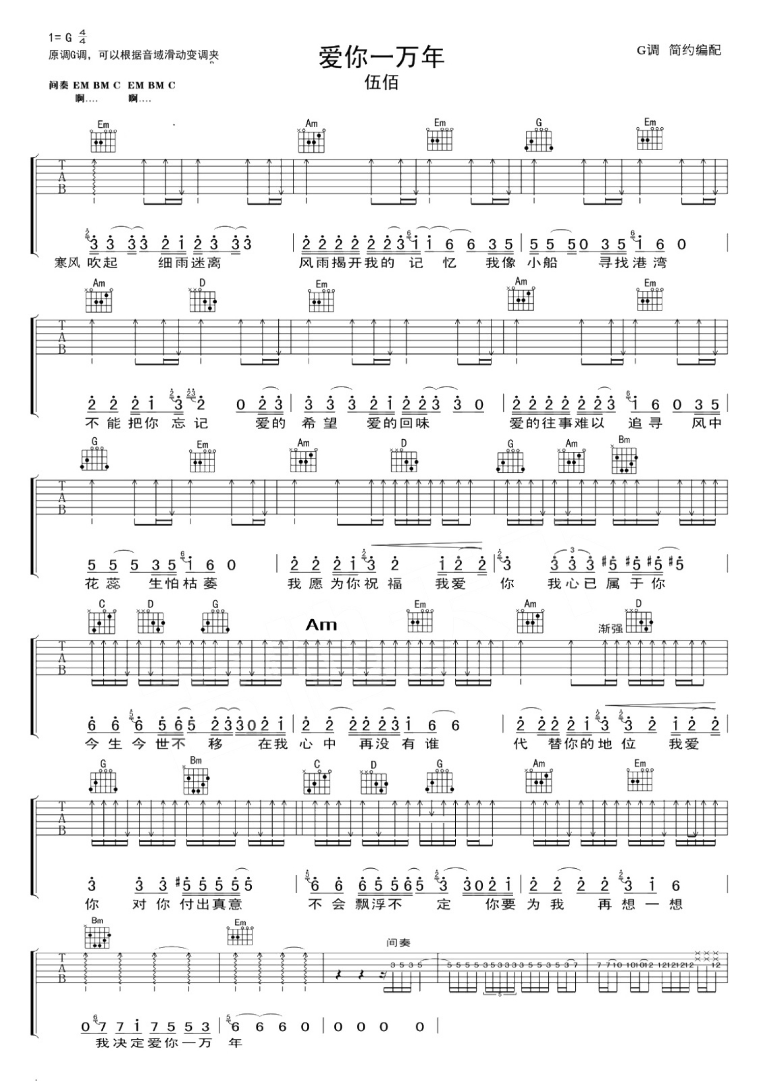 曲谱介绍: 伍佰《爱你一万年》吉他谱_G调吉他弹唱谱