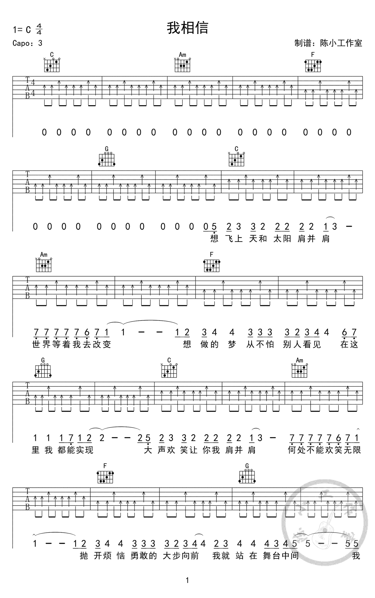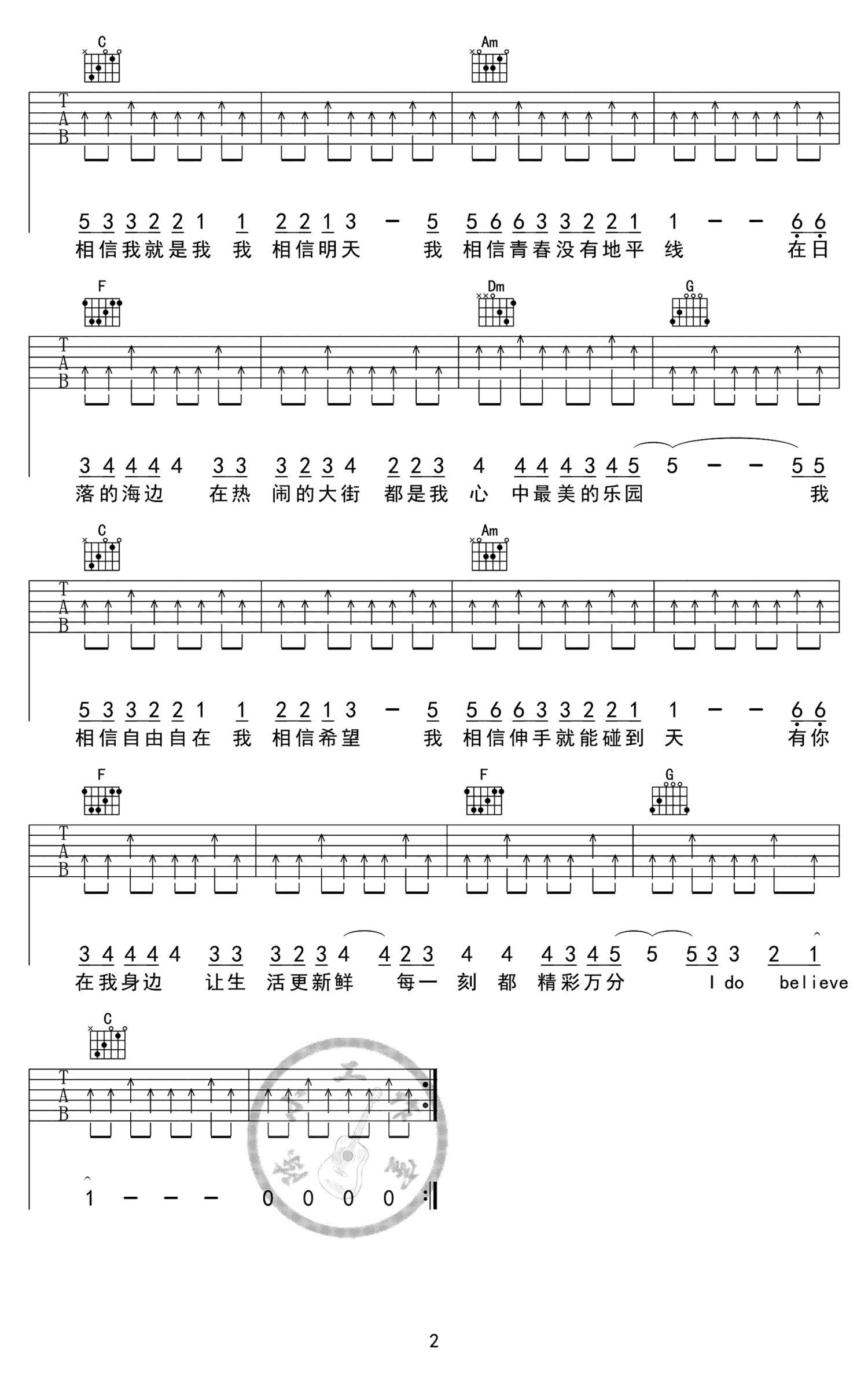 曲谱介绍: 我相信吉他谱,杨培安《我相信》,二张高清图片谱,一首让人心情激荡的青春热血励志歌曲,我相信六线谱,选用C调指法,Capo:3品