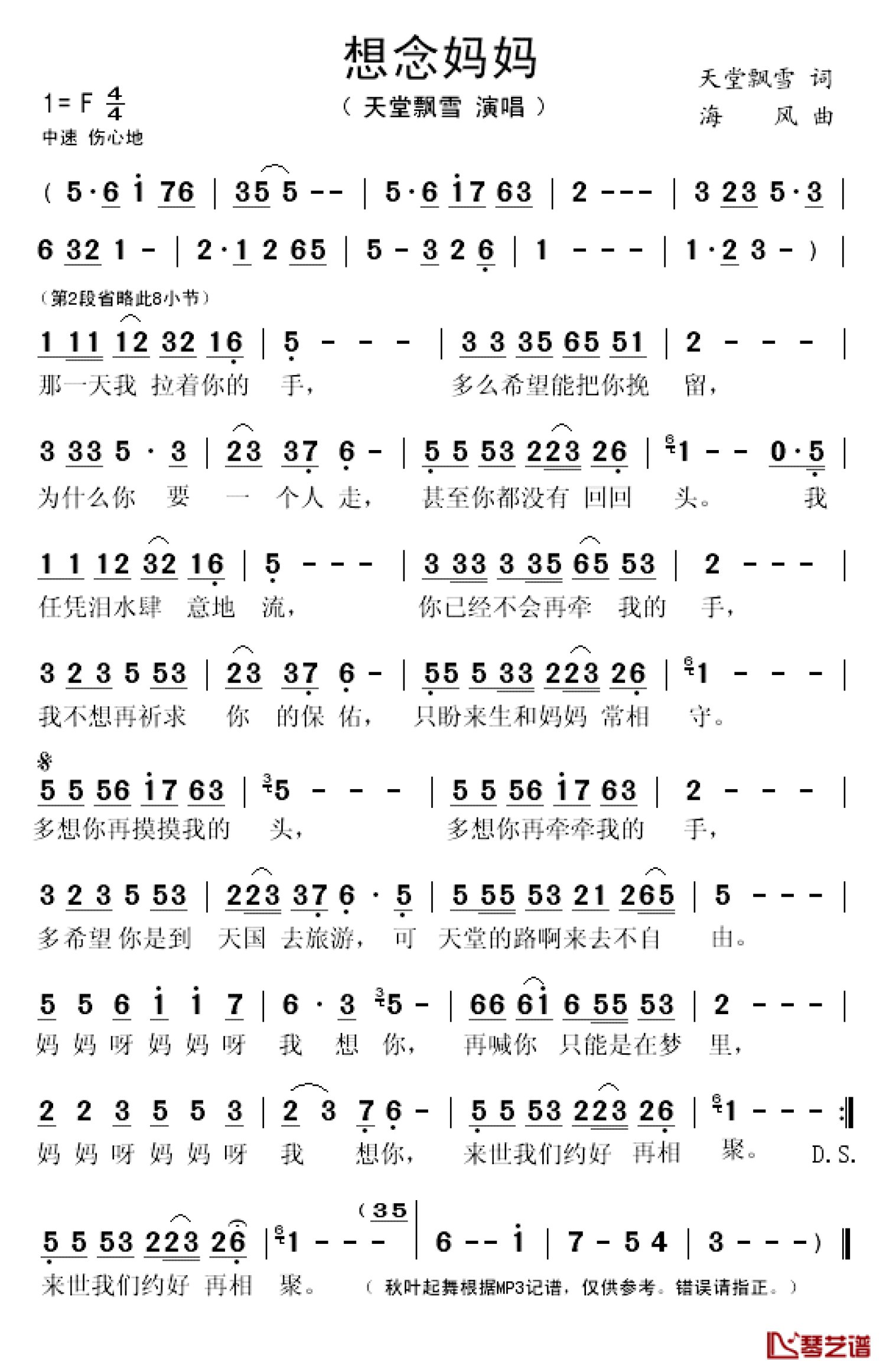 曲谱介绍: 天堂飘雪《想念妈妈》歌词_简谱