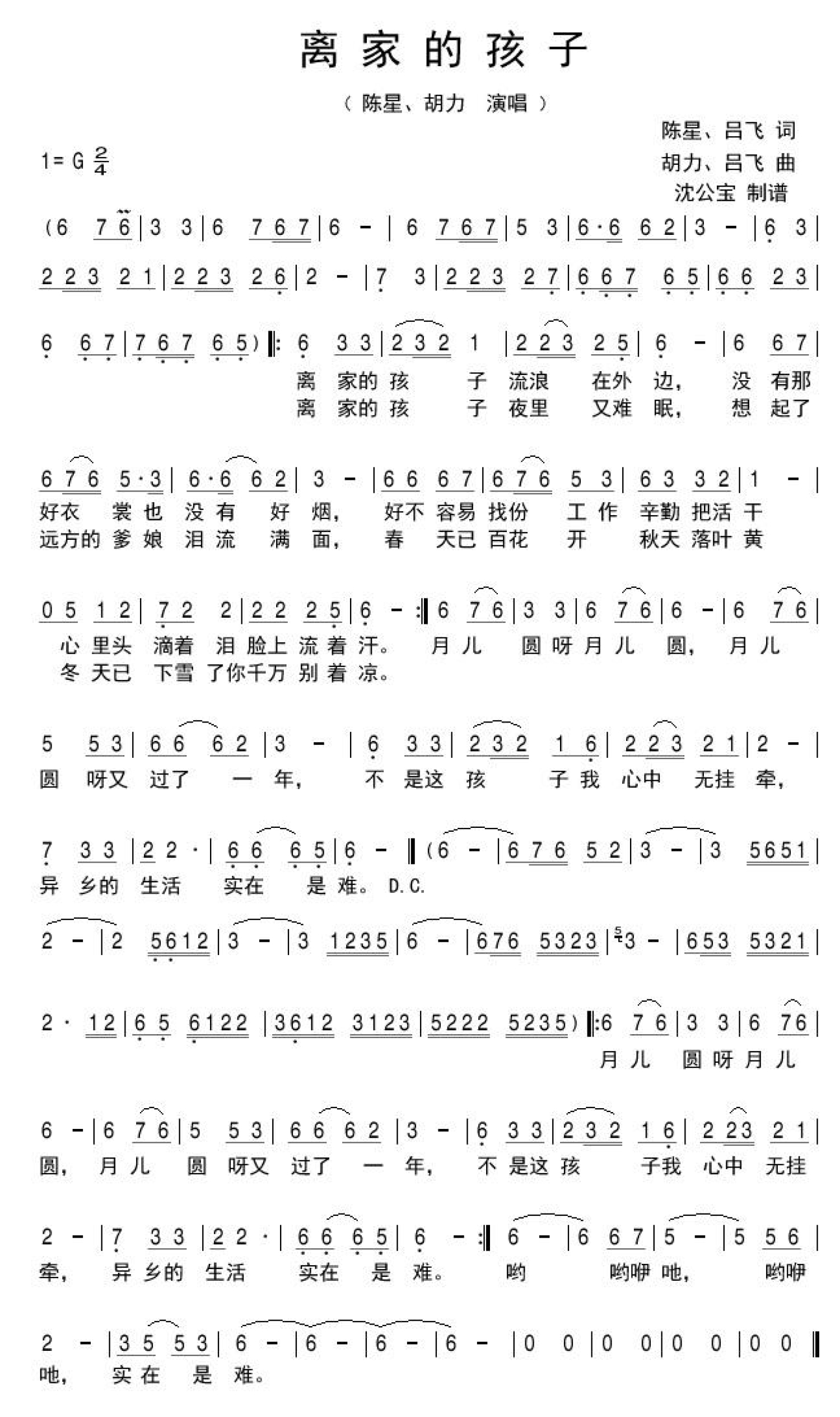 曲谱介绍: 陈星、胡力《离家的孩子》歌词_简谱