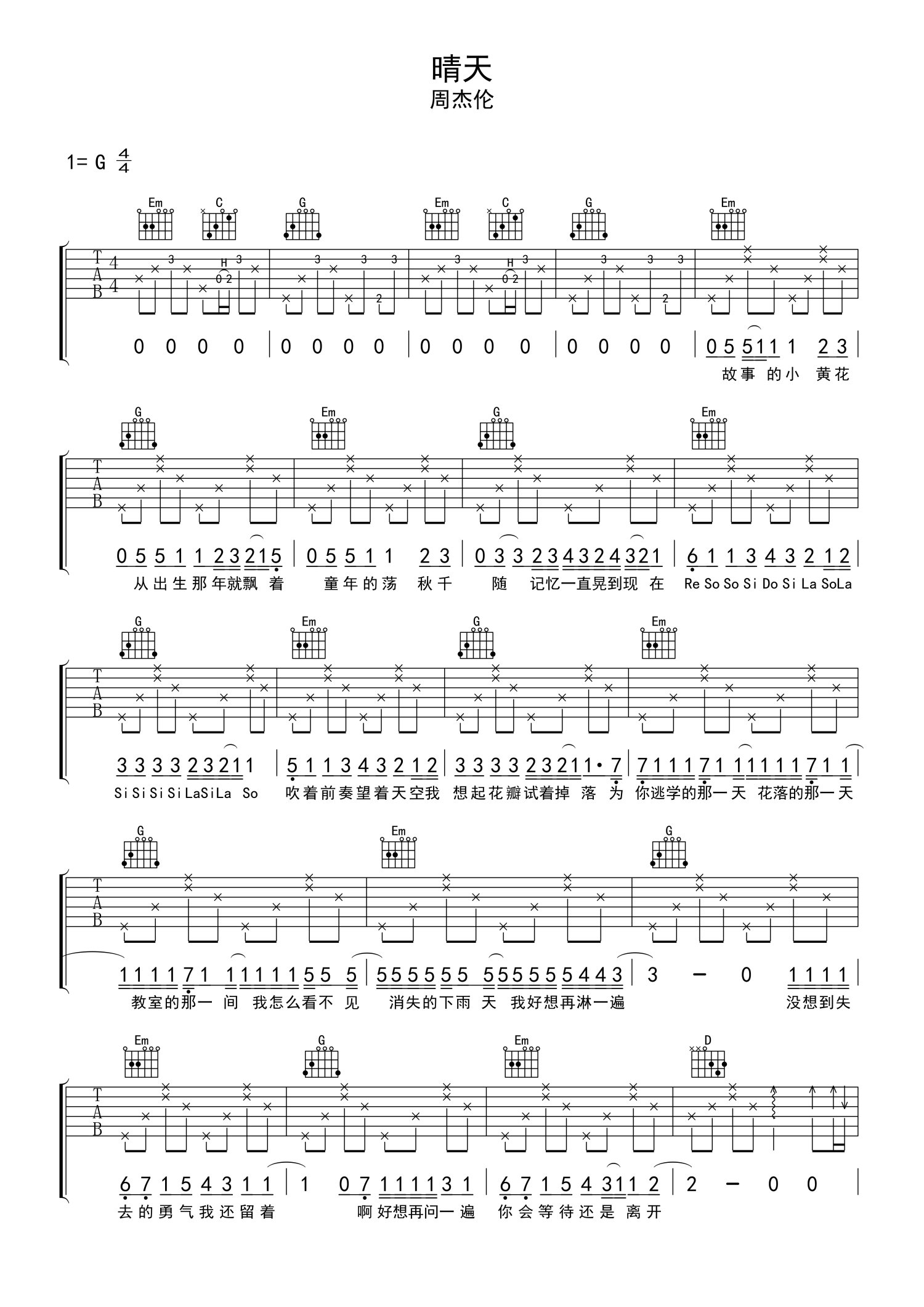 曲谱介绍: 周杰伦《晴天》吉他谱_G调吉他弹唱谱_简单版