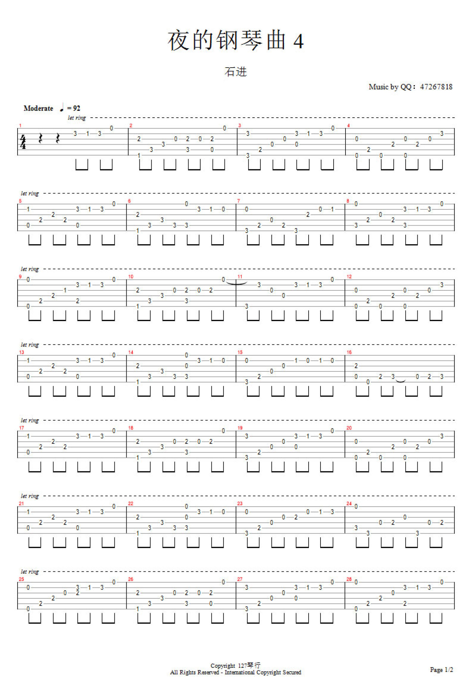 夜的钢琴曲4吉他谱 - 石进 - 吉他独奏谱