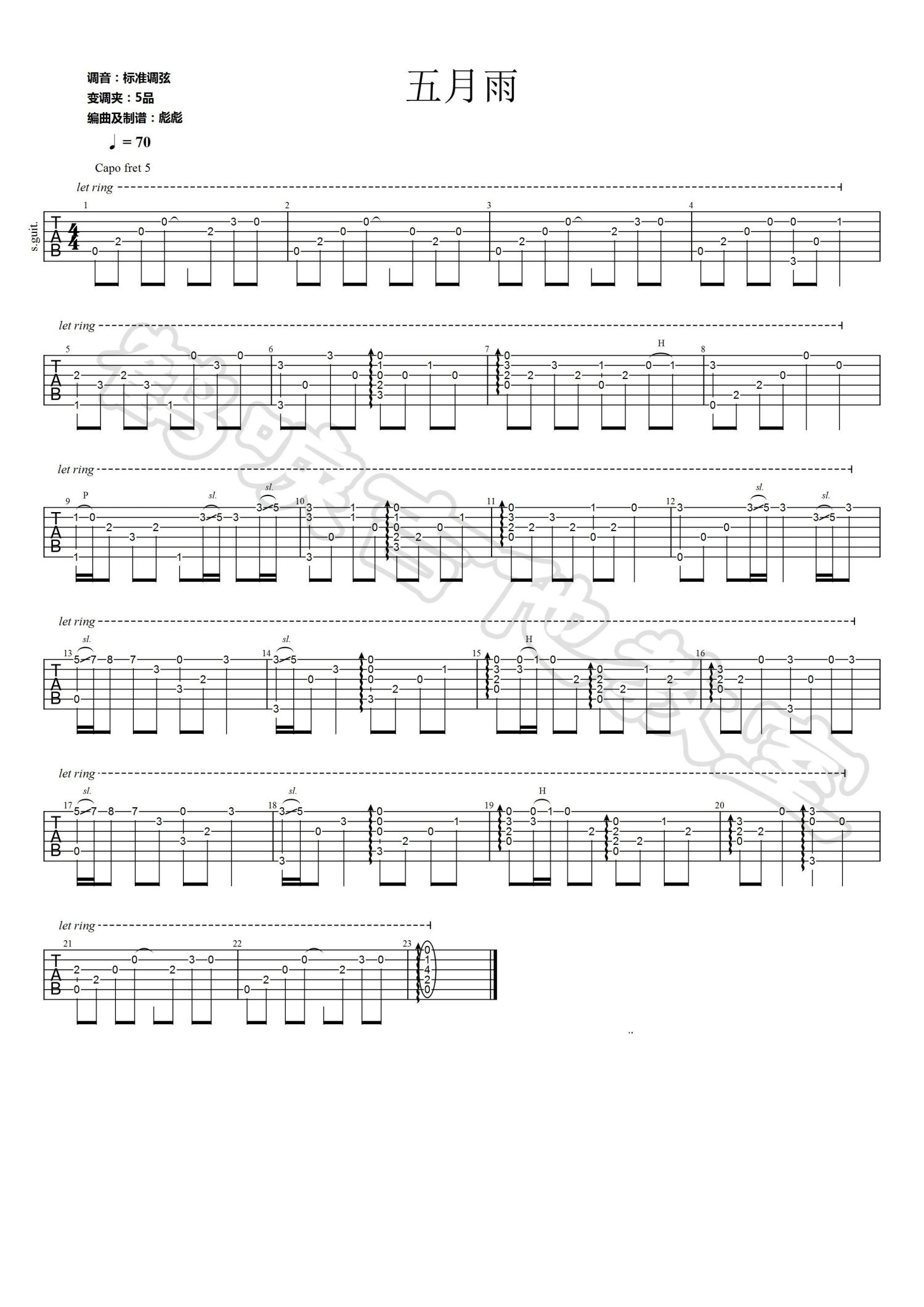 曲谱介绍: 《五月雨》是日本动画《火影忍者》中的插曲,该曲子用小提琴和钢琴的配合演奏,亦快亦慢的演奏方式,融会贯通的表现手法,仿佛让我们感到鸣人的奋斗、成长,鸣人的同伴们的故事就在身边,以及这个忍者世界的各种争斗和阴谋扣人心弦。《五月雨》吉他指弹视频演示《五月雨》吉他指弹视频教学演奏变调夹夹第五品,视频里夹第六品是因为做了降半音处理。歌曲整体还是比较简单的,老师也有分小节的讲解,喜欢的朋友来试试吧。