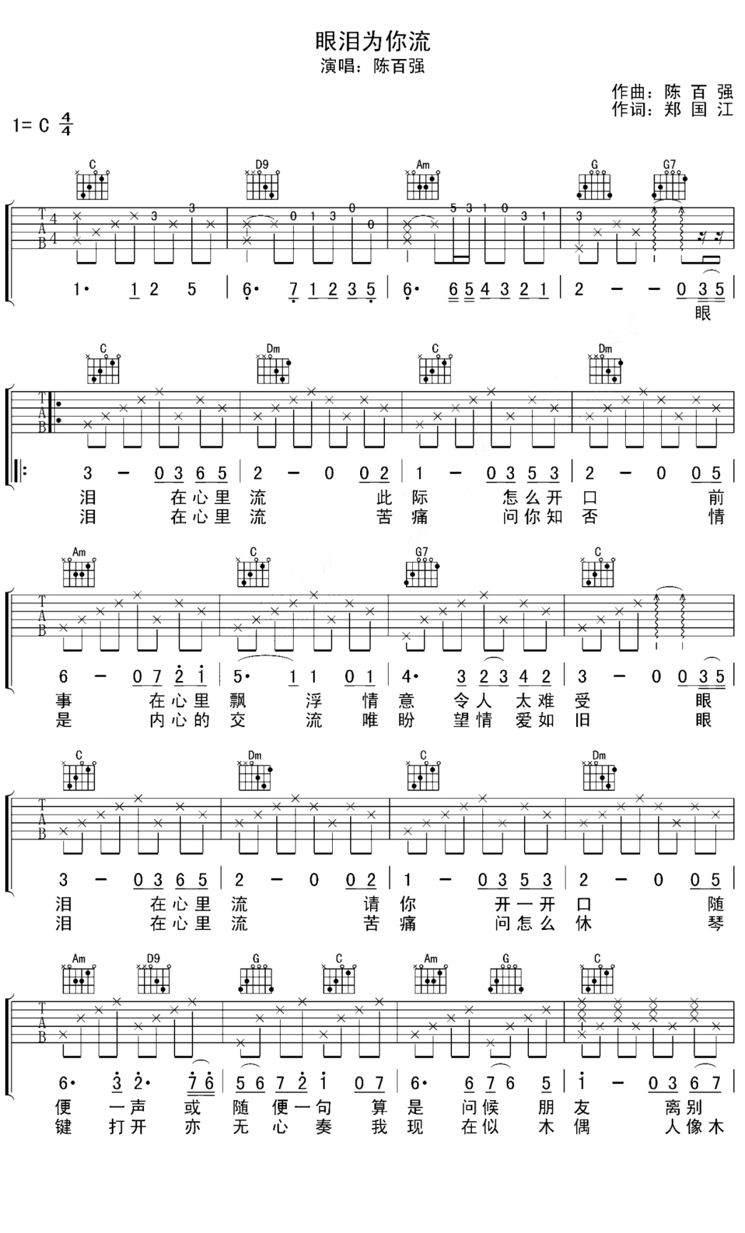 曲谱介绍: 陈百强《眼泪为你流》吉他谱_C调吉他弹唱谱