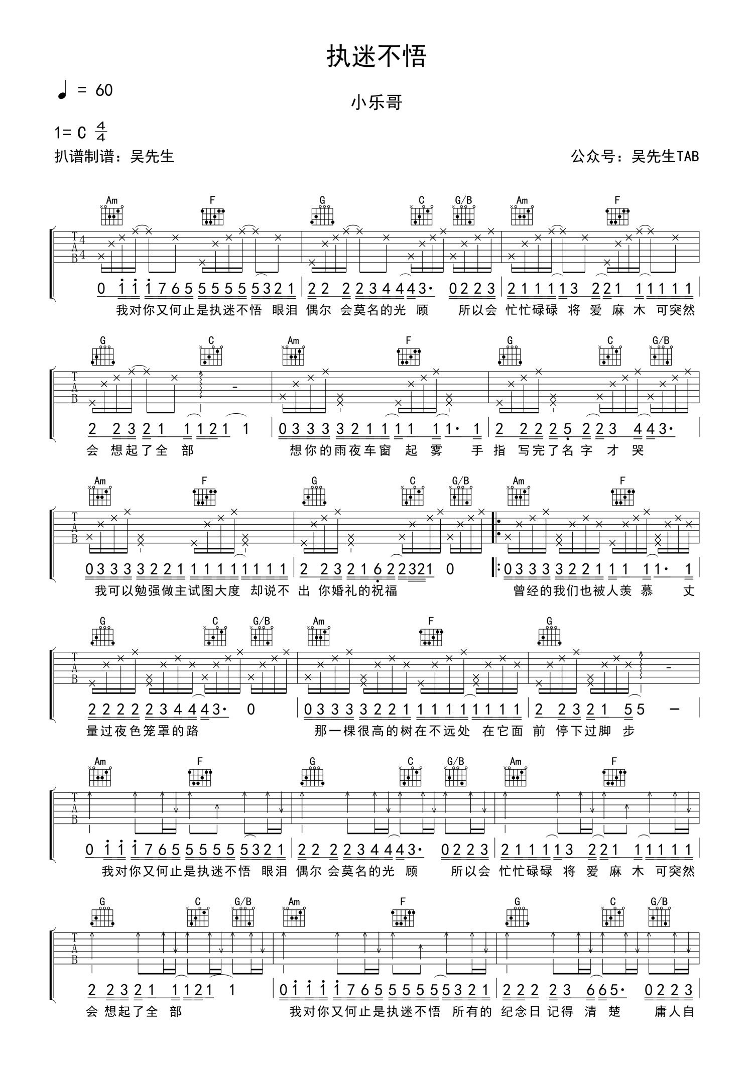 曲谱介绍: 小乐哥《执迷不悟》吉他谱_C调吉他弹唱谱