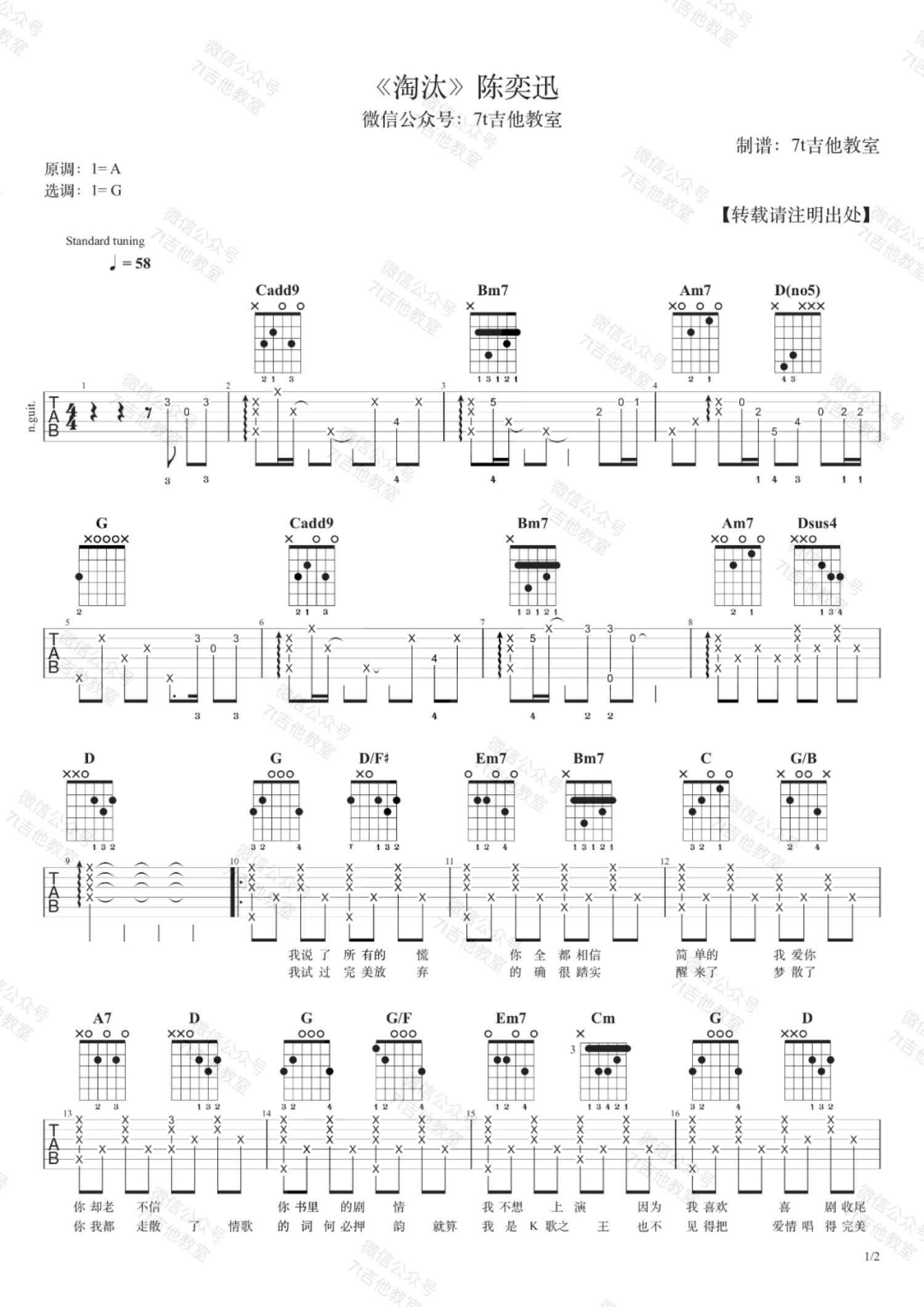 曲谱介绍: 淘汰吉他谱G调7T吉他教室版本。这是出自陈奕迅的个人专辑《认了吧》这部专辑里面有非常适合疗伤,都是在情感中受伤的男孩女孩的疗伤曲目呀,这首《淘汰》也是声声入耳,唱的人唱得很投入,听的人也会非常伤心吧,这首歌曲的唱词都太令人伤心了,就像大多数听众非常熟悉的这句唱词,只能说我输了,也许是你怕了,你用力开烫下句点,是吧很多故事都是这样的,不得不结束吧。