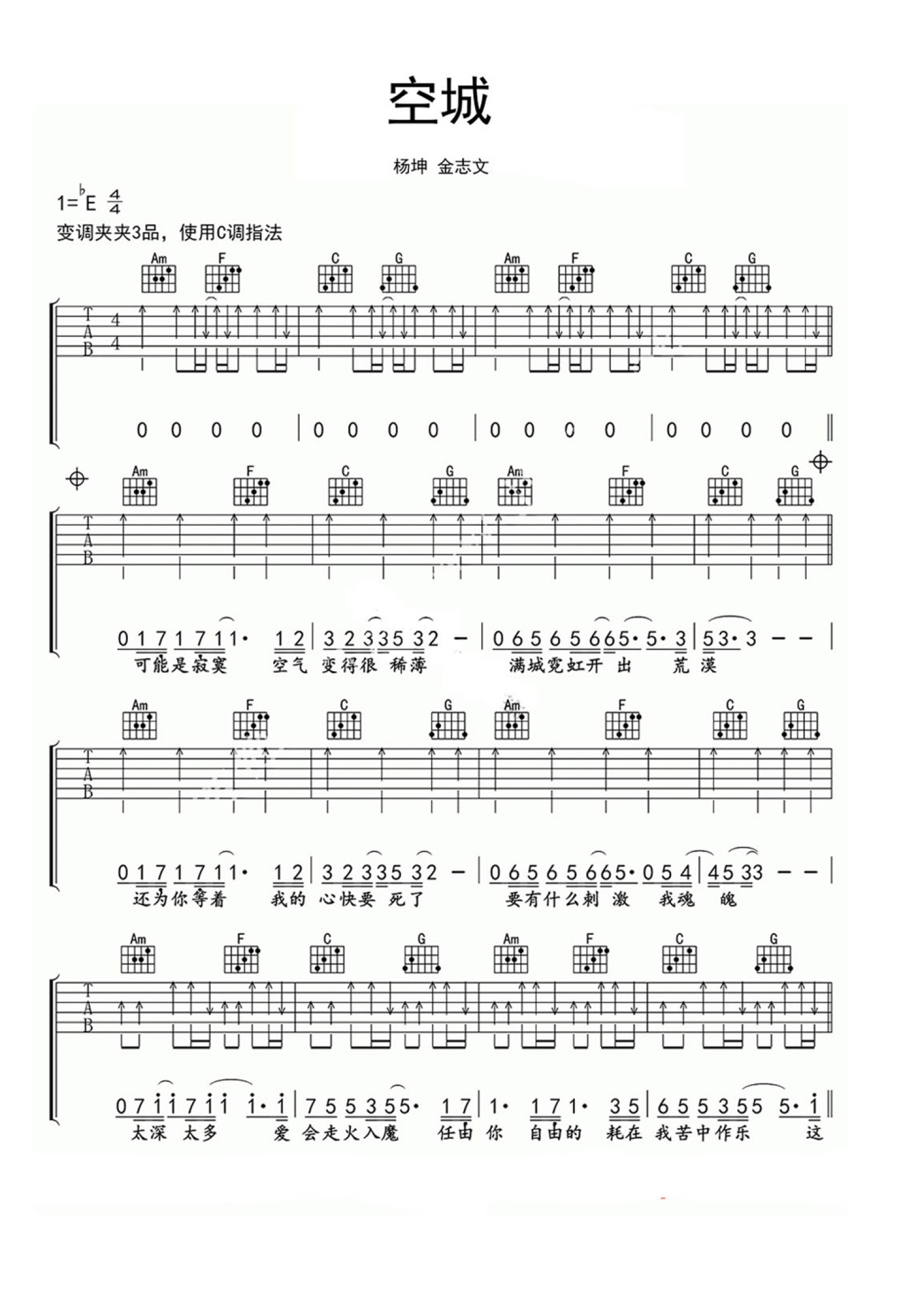 曲谱介绍: 空城吉他谱,杨坤演唱,原调bE调,变调夹3品,使用C调指法。金志文在好声音节目中深情演绎了这首歌曲,让人印象深刻。