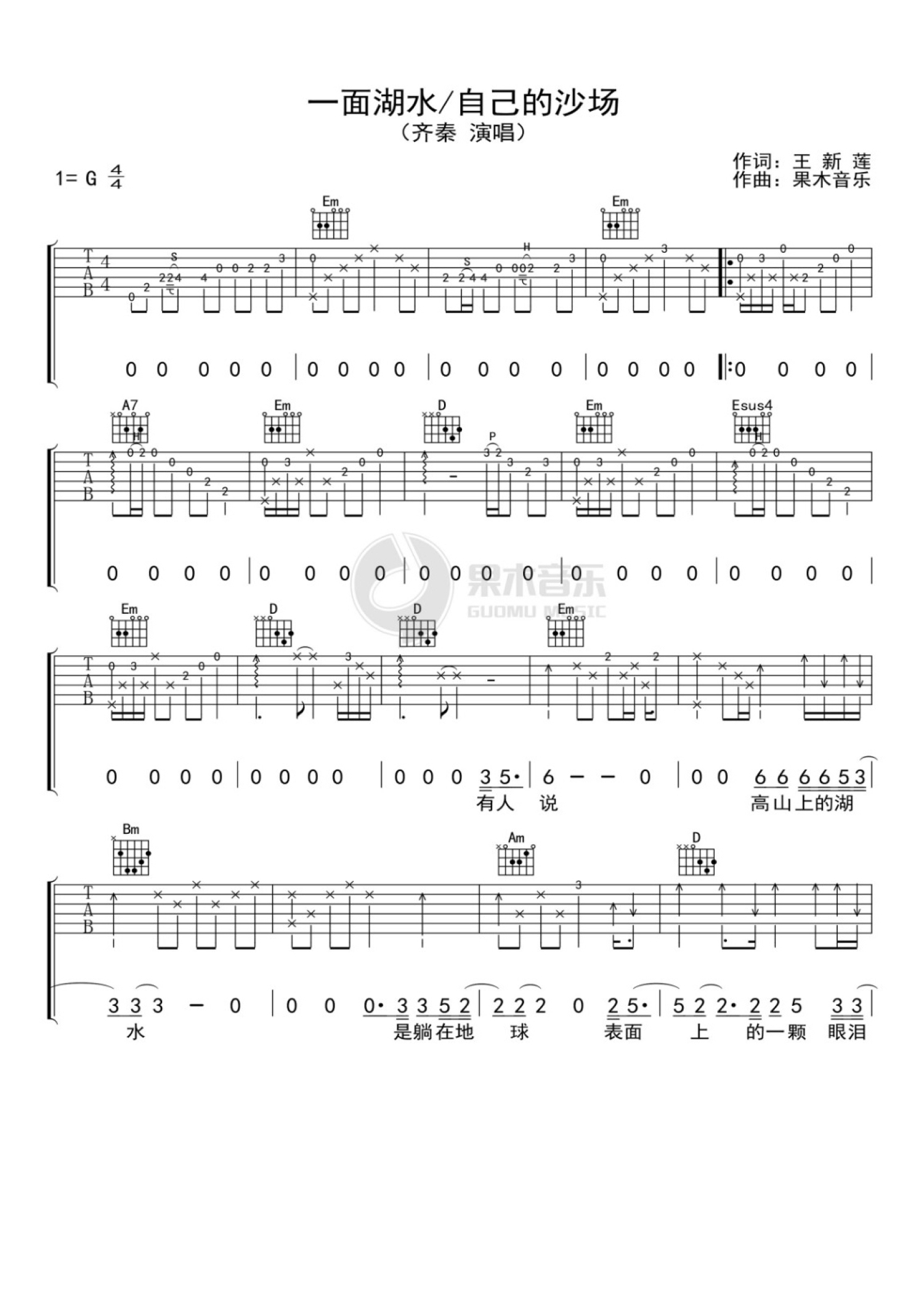 曲谱介绍: 齐秦《一面湖水自己的沙场》吉他谱_G调吉他弹唱谱