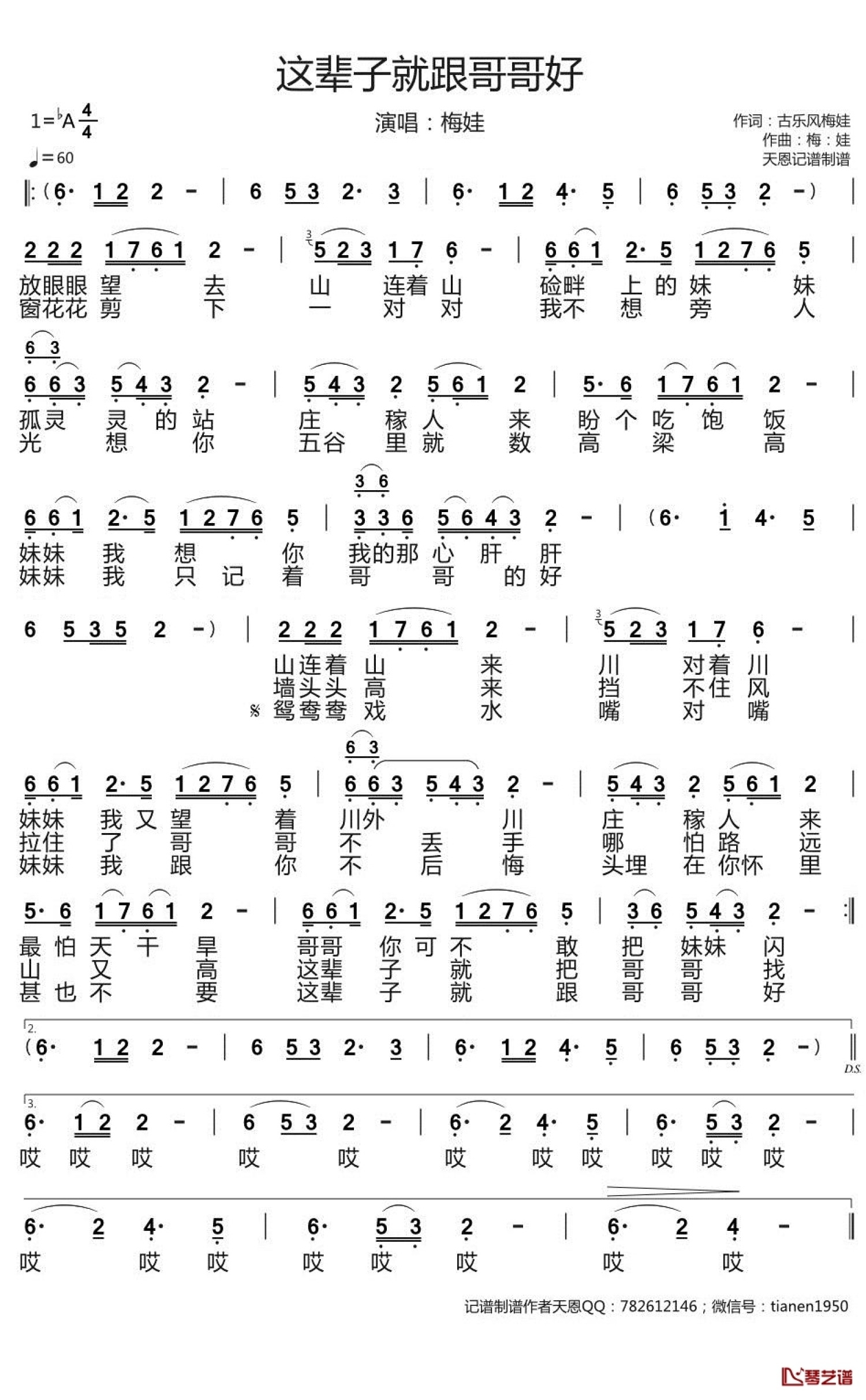 曲谱介绍: 梅娃《这辈子就跟哥哥好》歌词_简谱