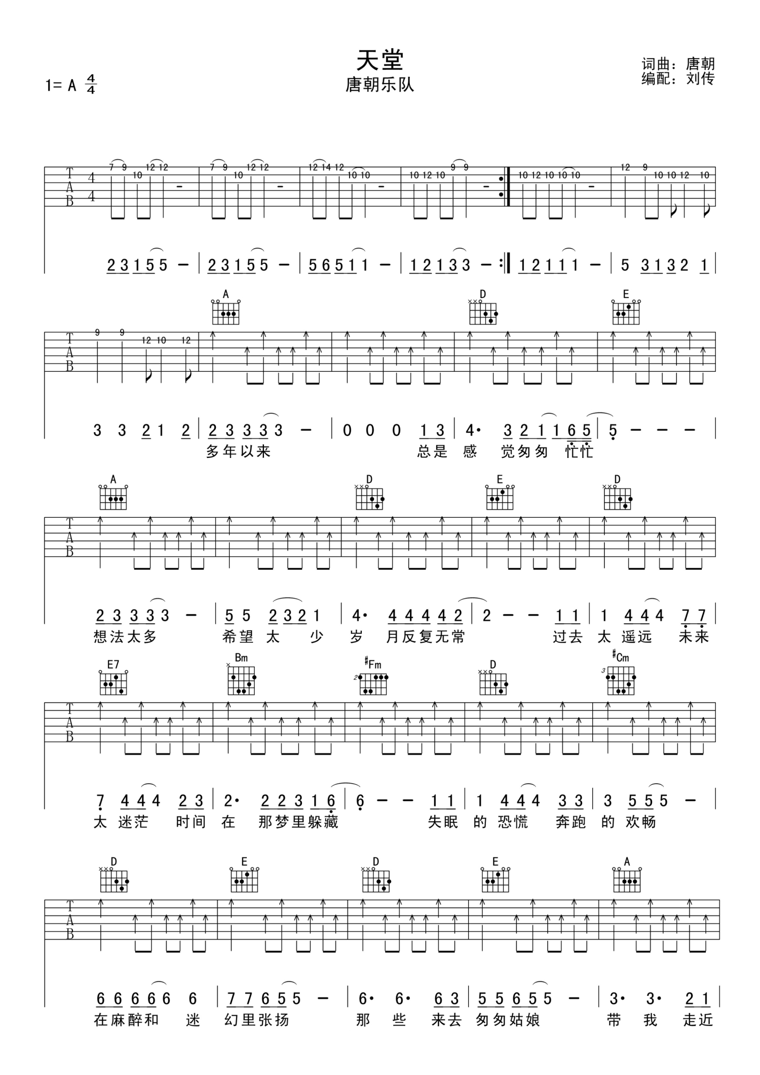 曲谱介绍: 唐朝乐队《天堂》吉他谱_A调吉他弹唱谱