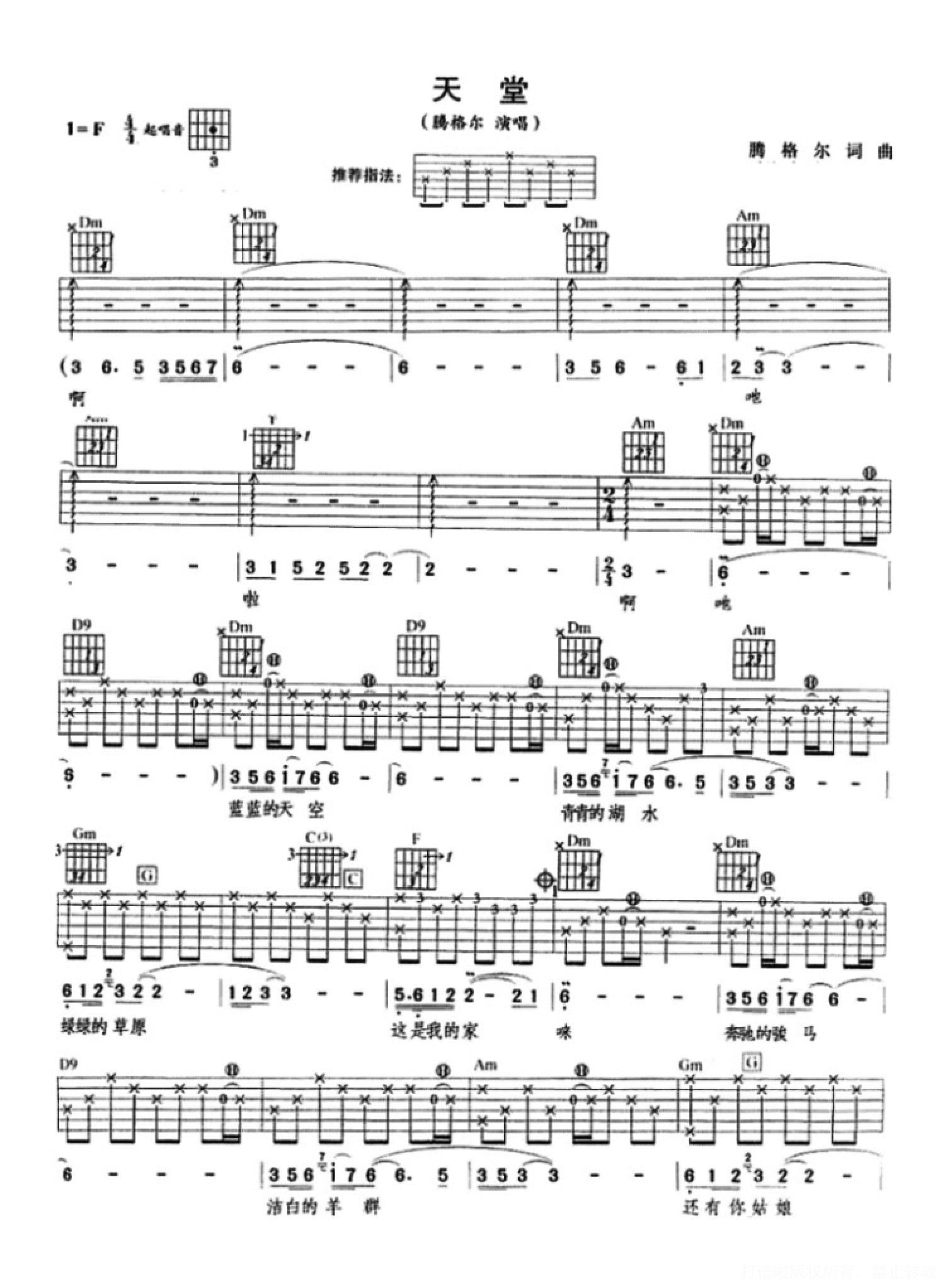 曲谱介绍: 腾格尔《天堂》吉他谱_F调吉他弹唱谱