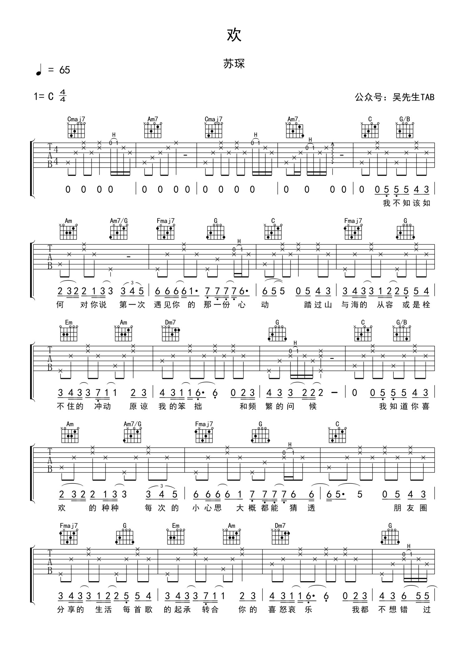 • 欢吉他谱 - 苏琛 - C调吉他弹唱谱第1张