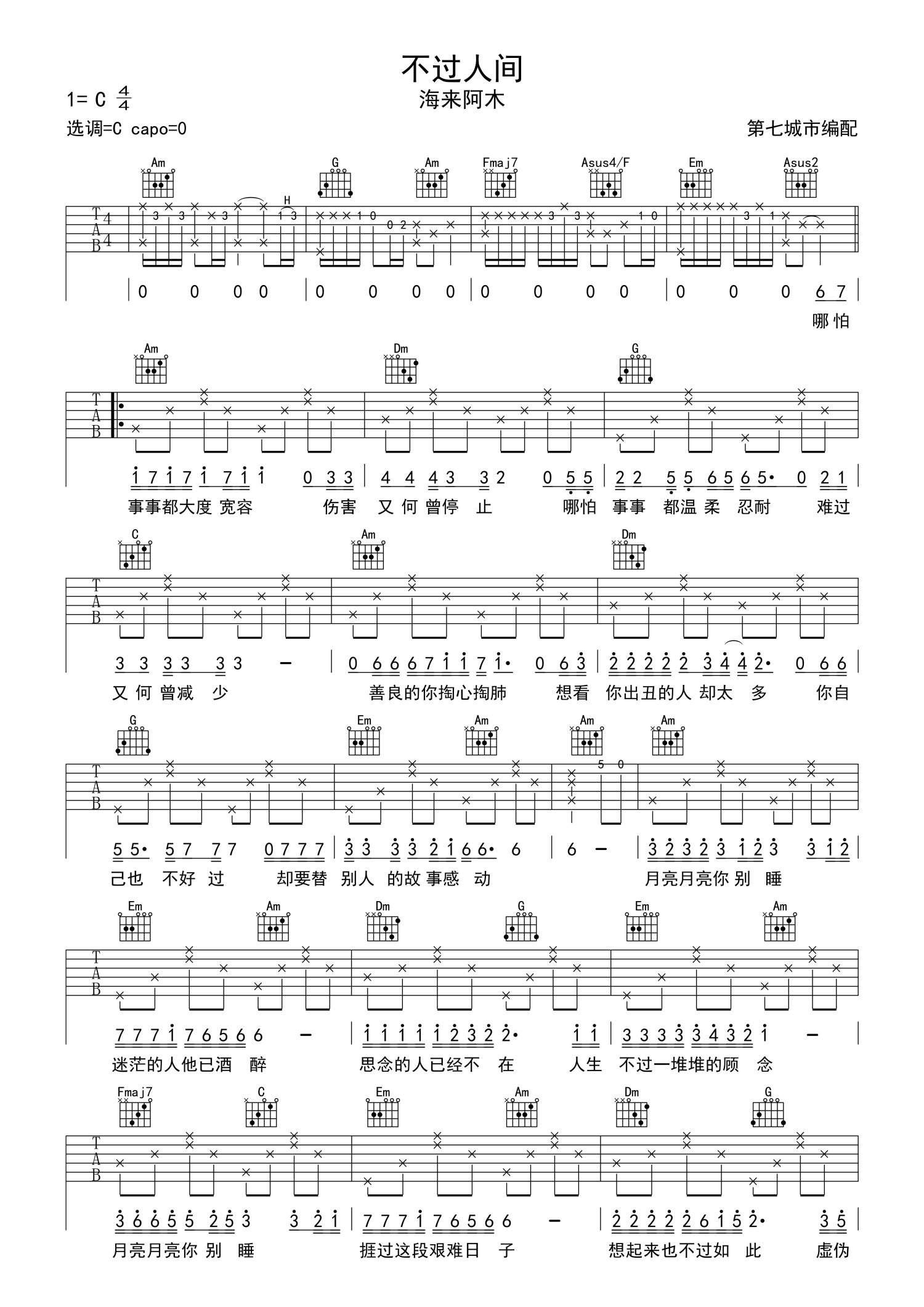 • 不过人间吉他谱 - 海来阿木 - C调吉他弹唱谱第1张