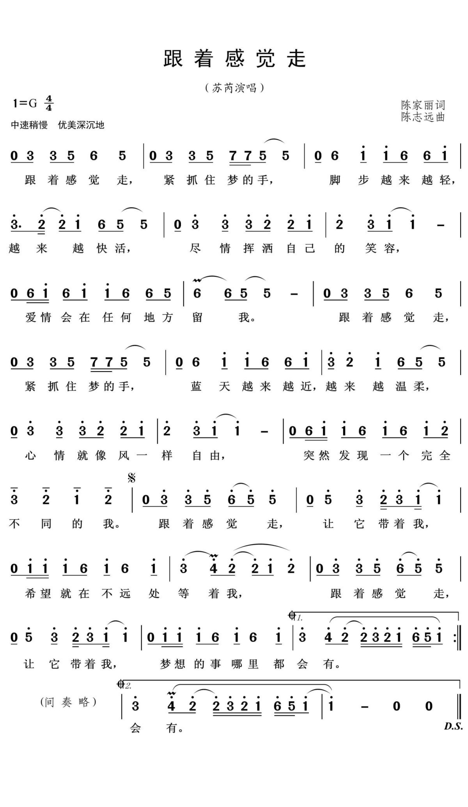 曲谱介绍: 苏芮《跟着感觉走》歌词_简谱