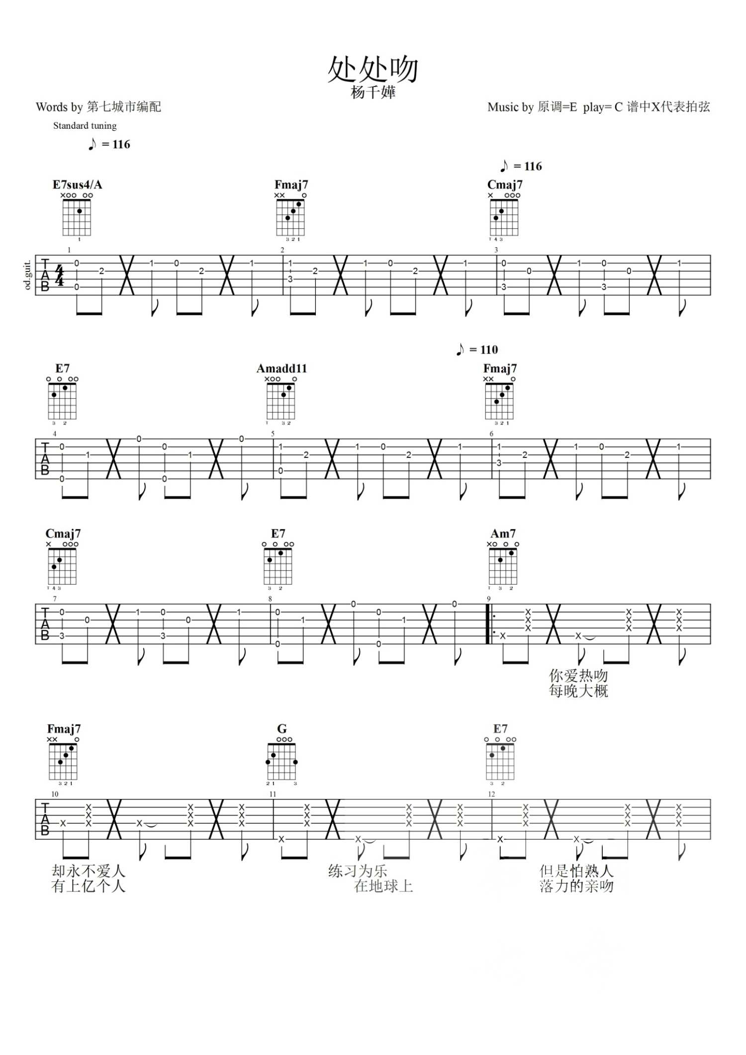 曲谱介绍: 杨千嬅《处处吻》吉他谱_C调吉他弹唱谱