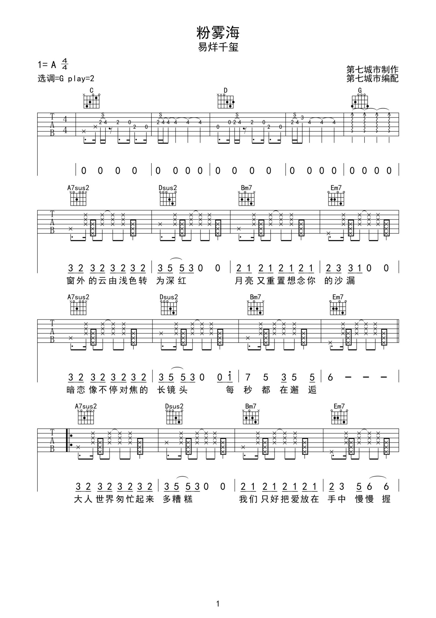 • 粉雾海吉他谱 - 易烊千玺 - G调吉他弹唱谱第1张