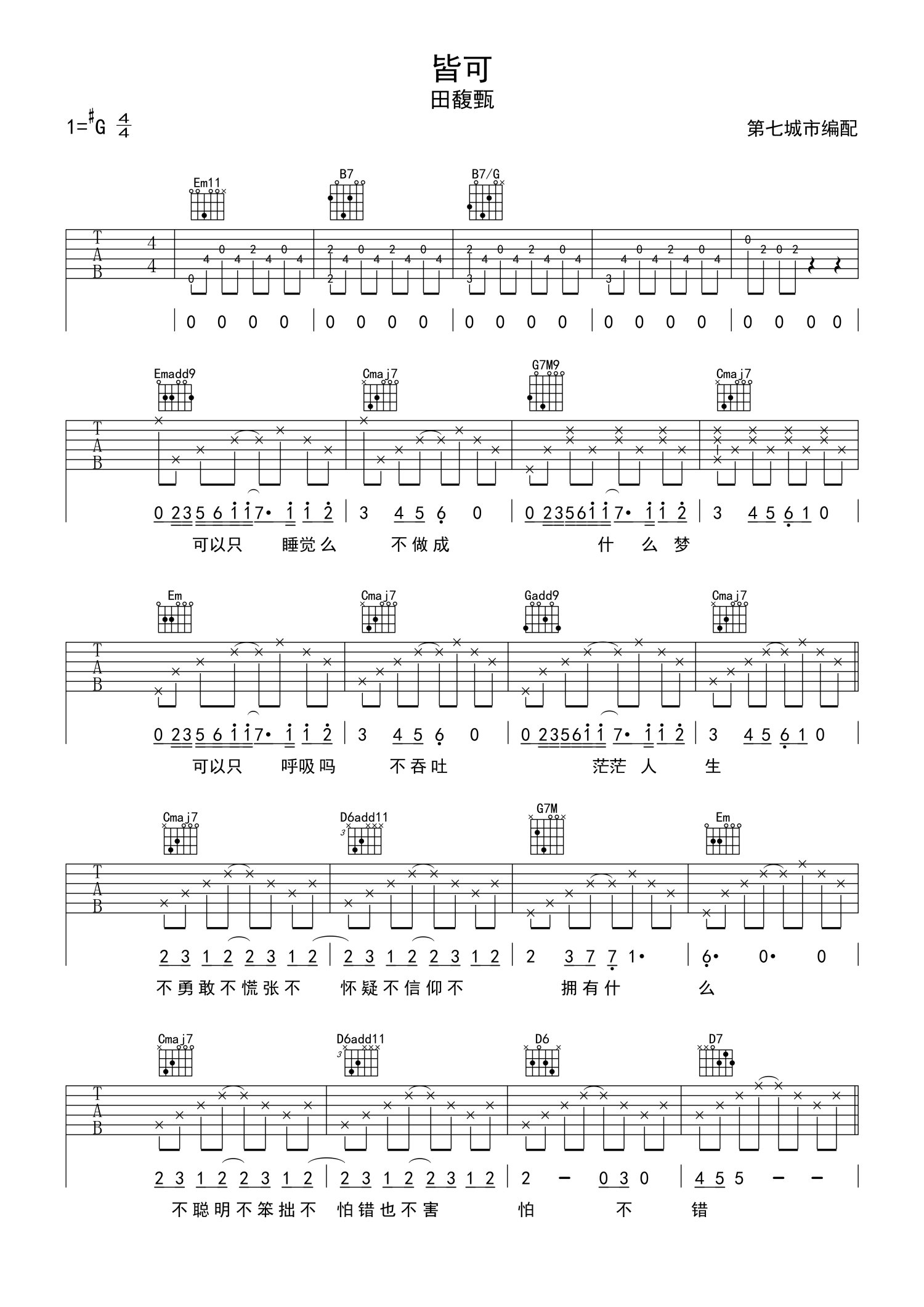 • 皆可吉他谱 - 田馥甄 - G调吉他弹唱谱第1张