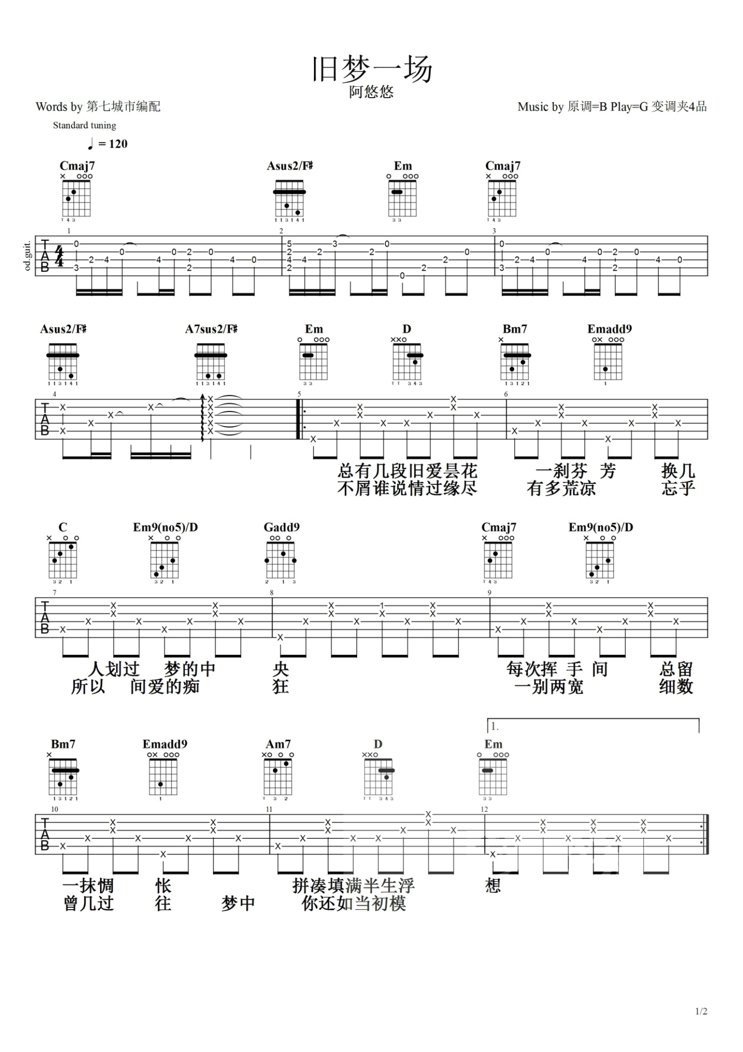 • 旧梦一场吉他谱 - 阿悠悠 - G调吉他弹唱谱第1张