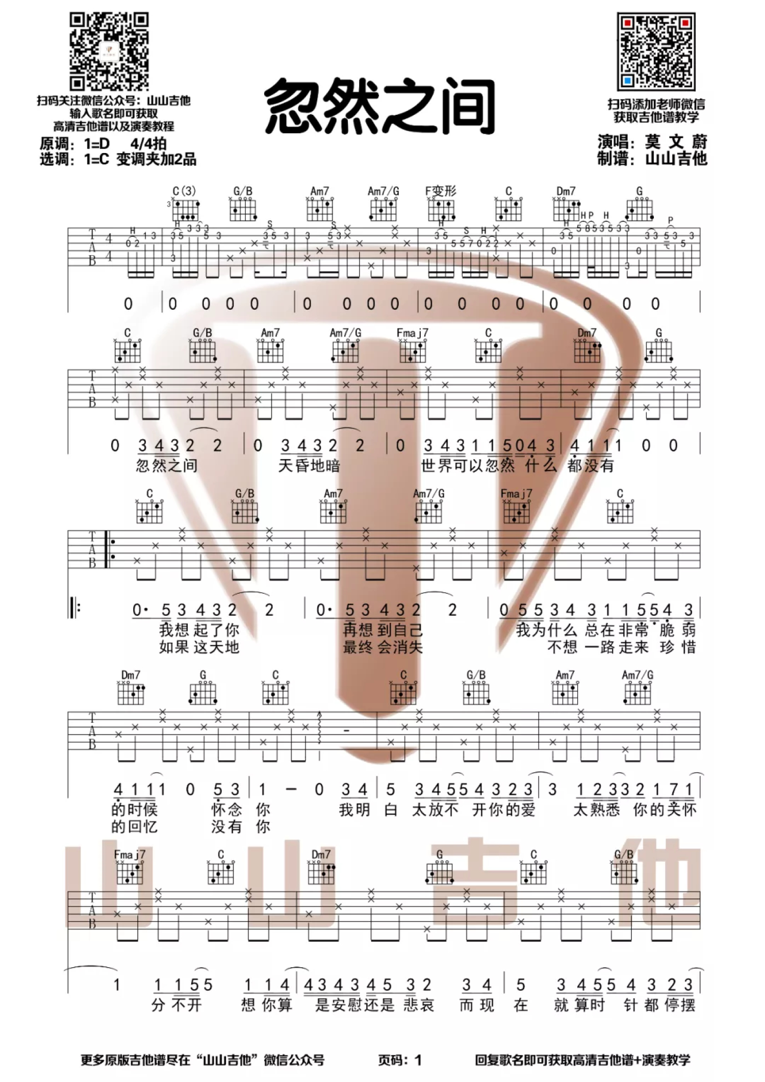 曲谱介绍: 只听歌名可能大多数人都会认为是一首普通的情歌作品,却未曾想到在这柔美的歌曲背后,蕴藏着生命的勇气和力量。这首为地震创作的歌曲,给了当时很多人精神上的鼓舞,同时也告诉我们,遇到灾难的时候要保持信心,乐观面对!《忽然之间》吉他弹唱视频演示《忽然之间》吉他弹唱视频教程来自山山吉他编配《忽然之间》吉他谱,选用C调和弦编配,山山老师也录制了演示视频供和教学视频,喜欢的朋友可详细学习。
