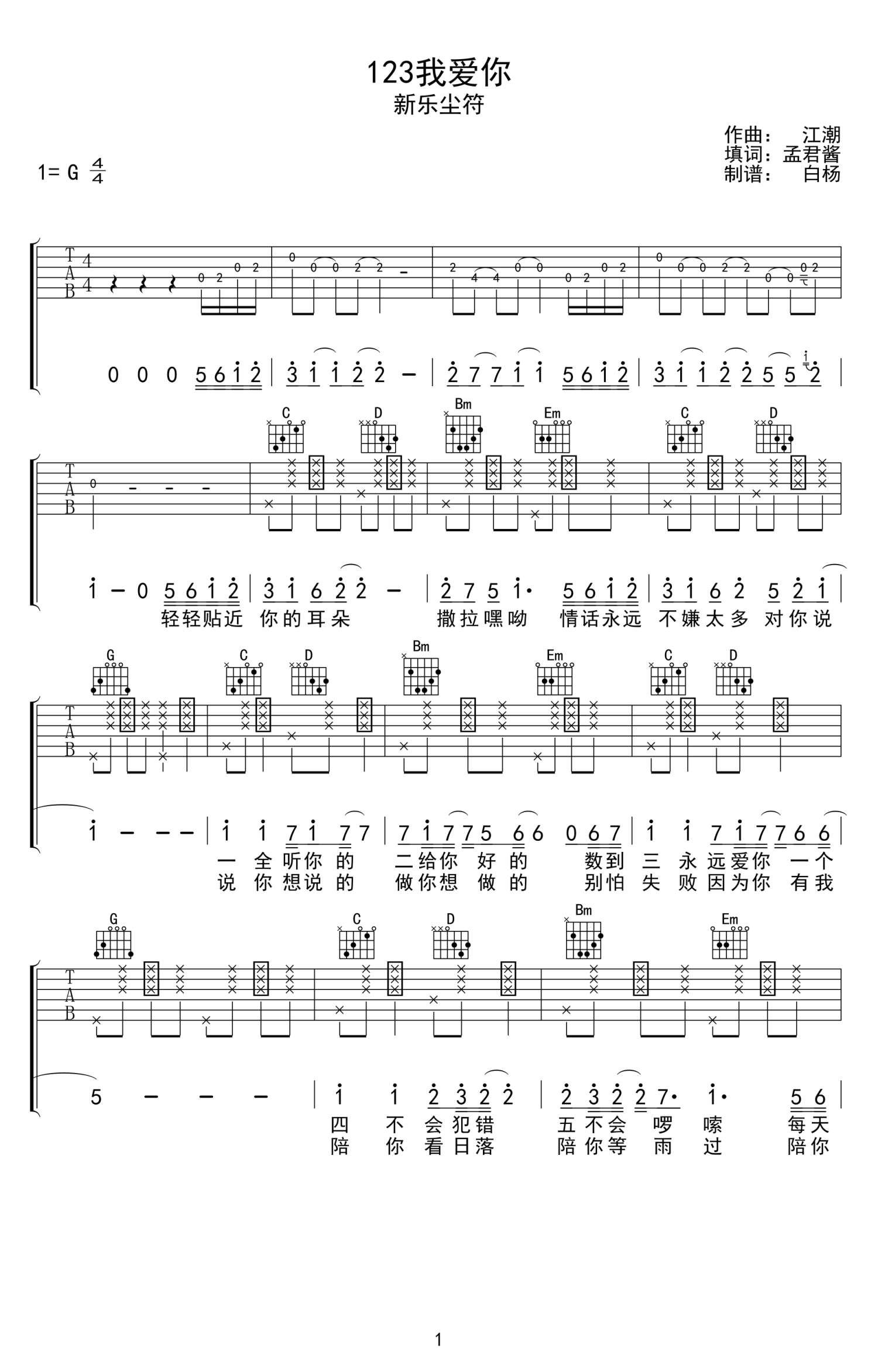 123我爱你吉他谱 - 新乐尘符 - G调吉他弹唱谱