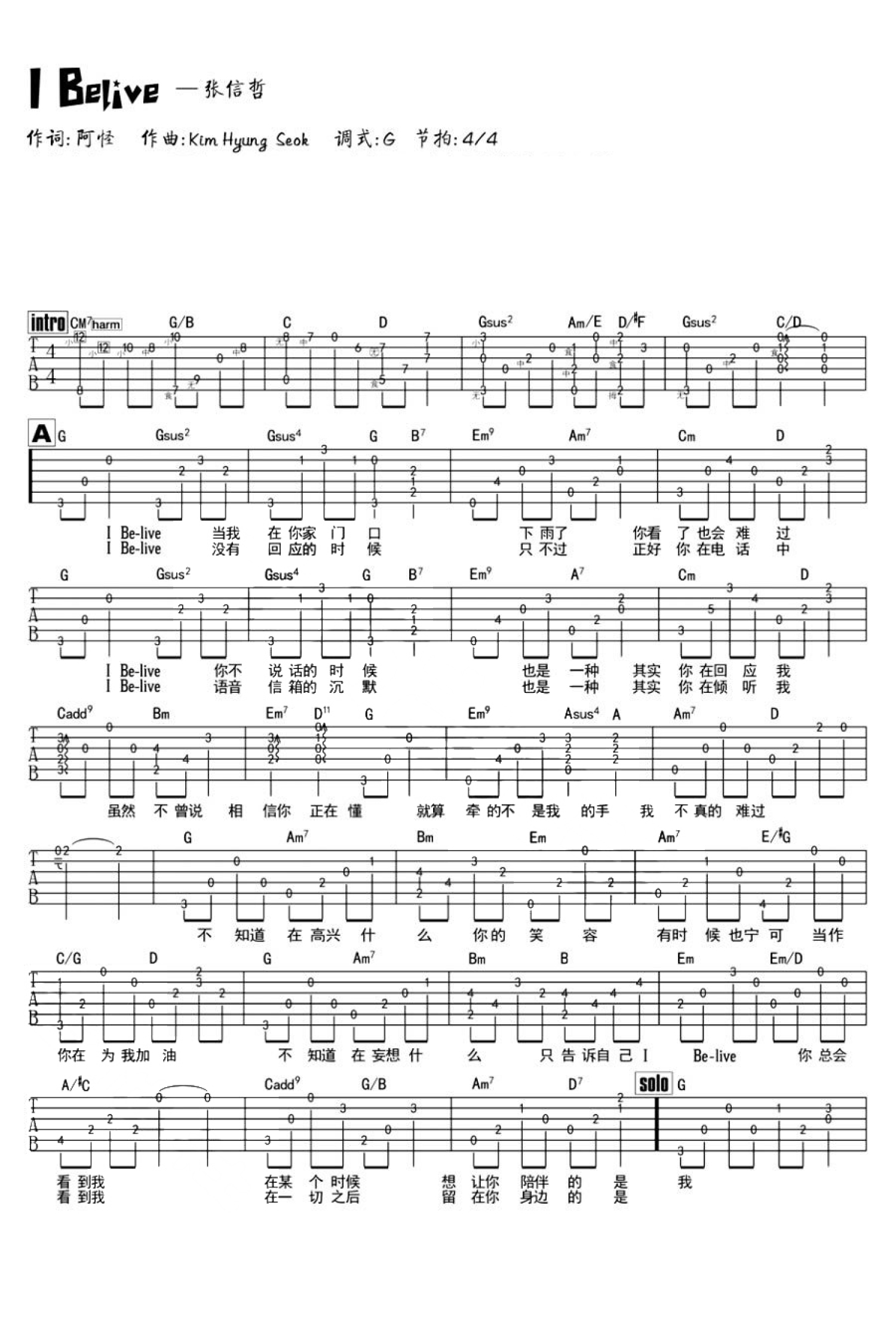 I Belive吉他谱 - 张信哲 - G调吉他弹唱谱