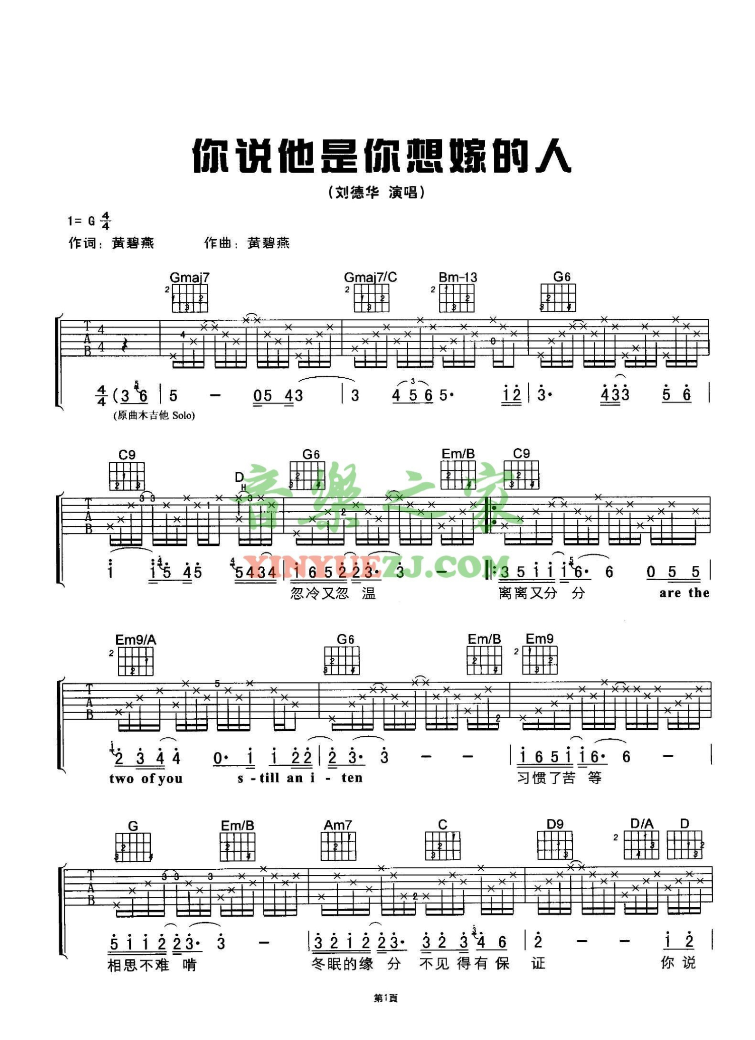 曲谱介绍: 刘德华《你说他是你想嫁的人》吉他谱_G调吉他弹唱谱