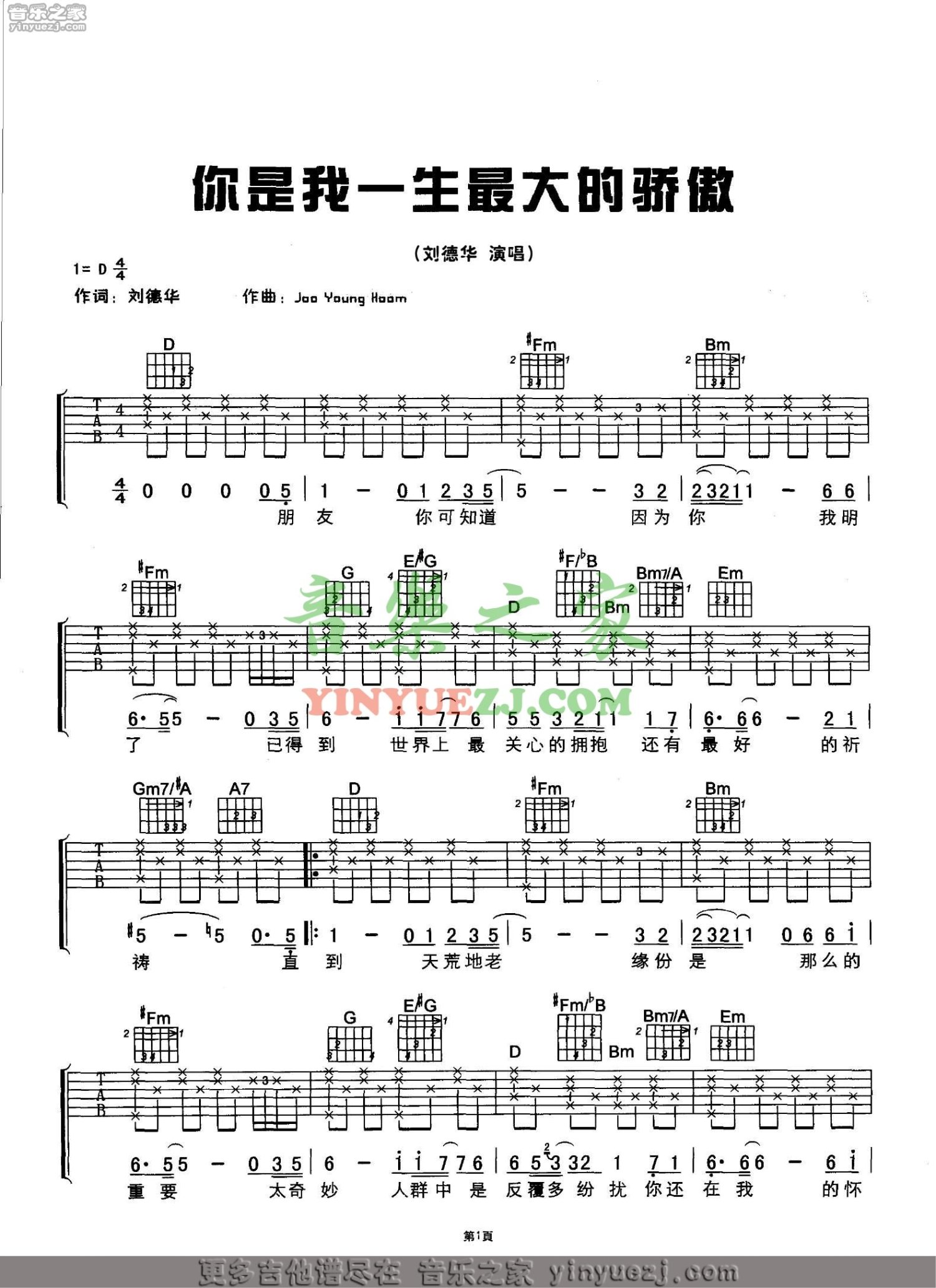 曲谱介绍: 刘德华《你是我一生最大的骄傲》吉他谱_D调吉他弹唱谱