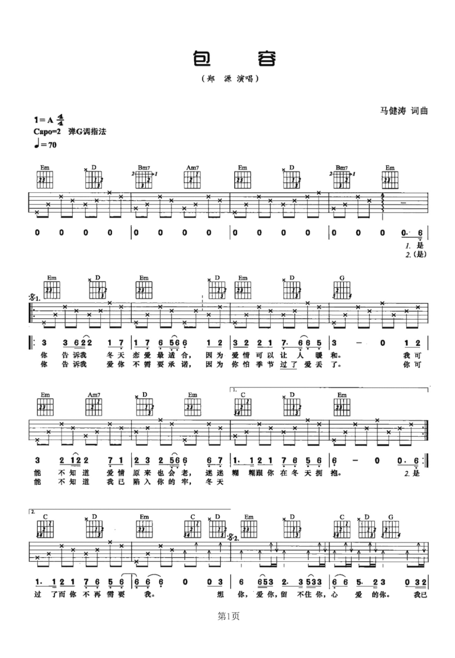 曲谱介绍: 郑源《包容》吉他谱_G调吉他弹唱谱