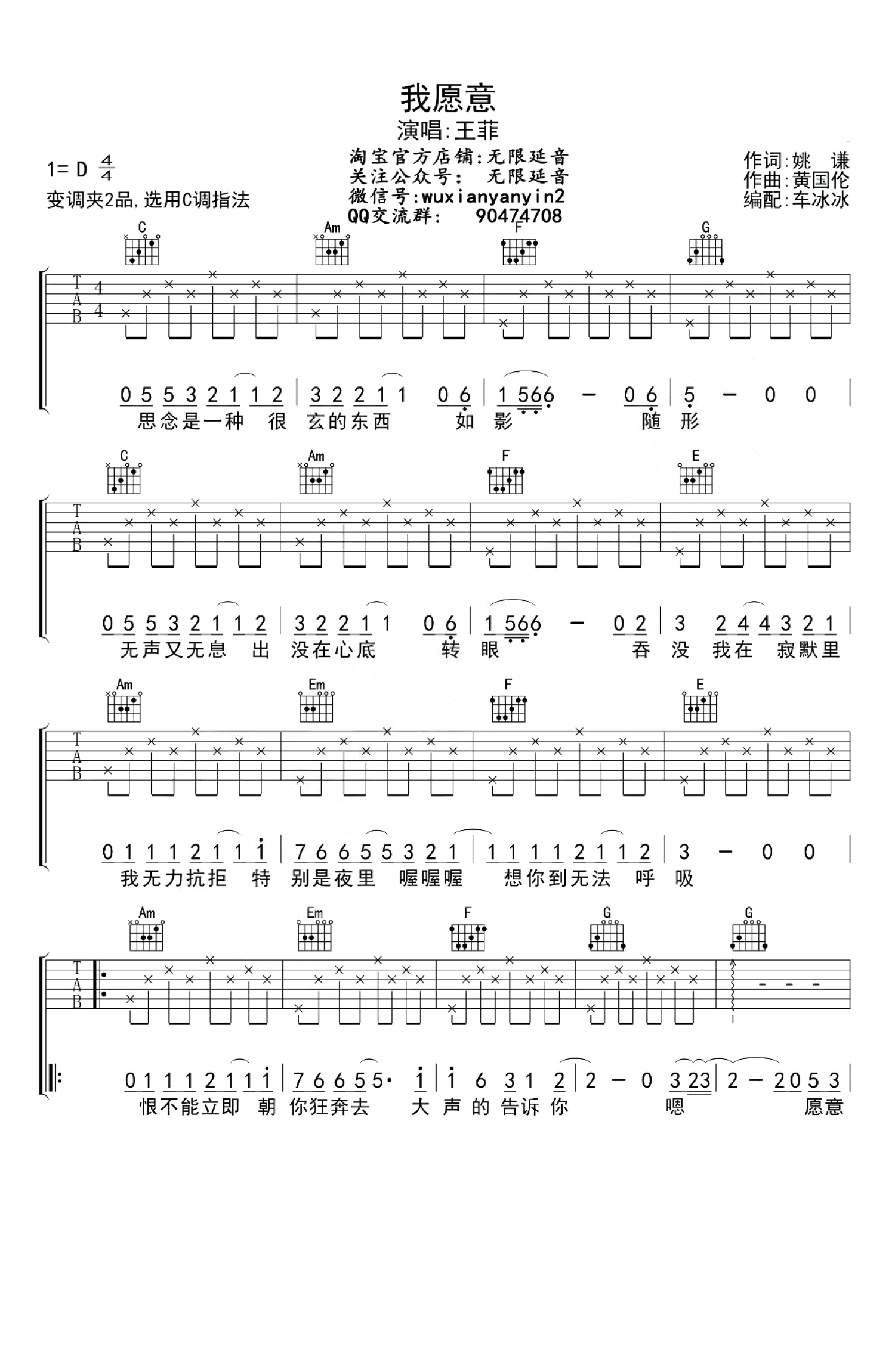 曲谱介绍: 王菲《我愿意》吉他谱_C调吉他弹唱谱