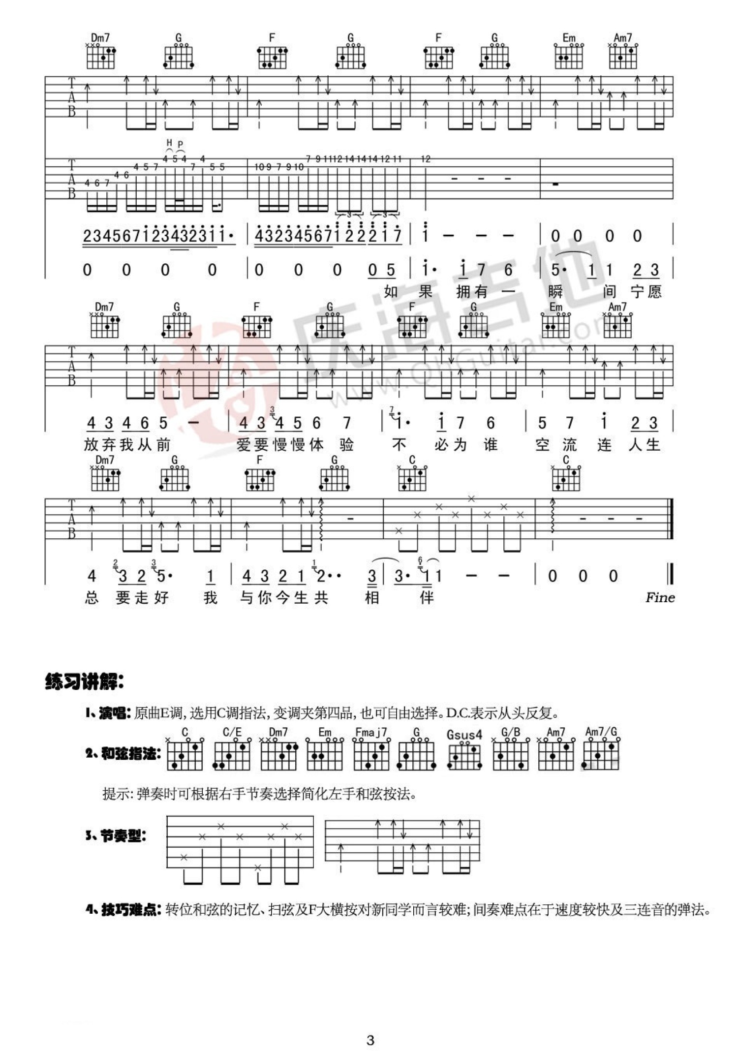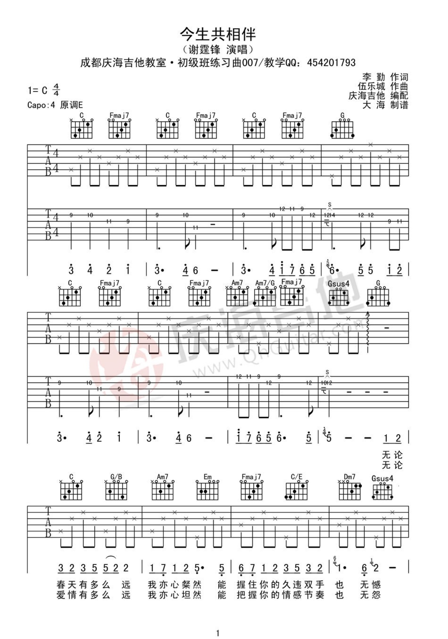 曲谱介绍: 谢霆锋《今生共相伴》吉他谱_C调吉他弹唱谱