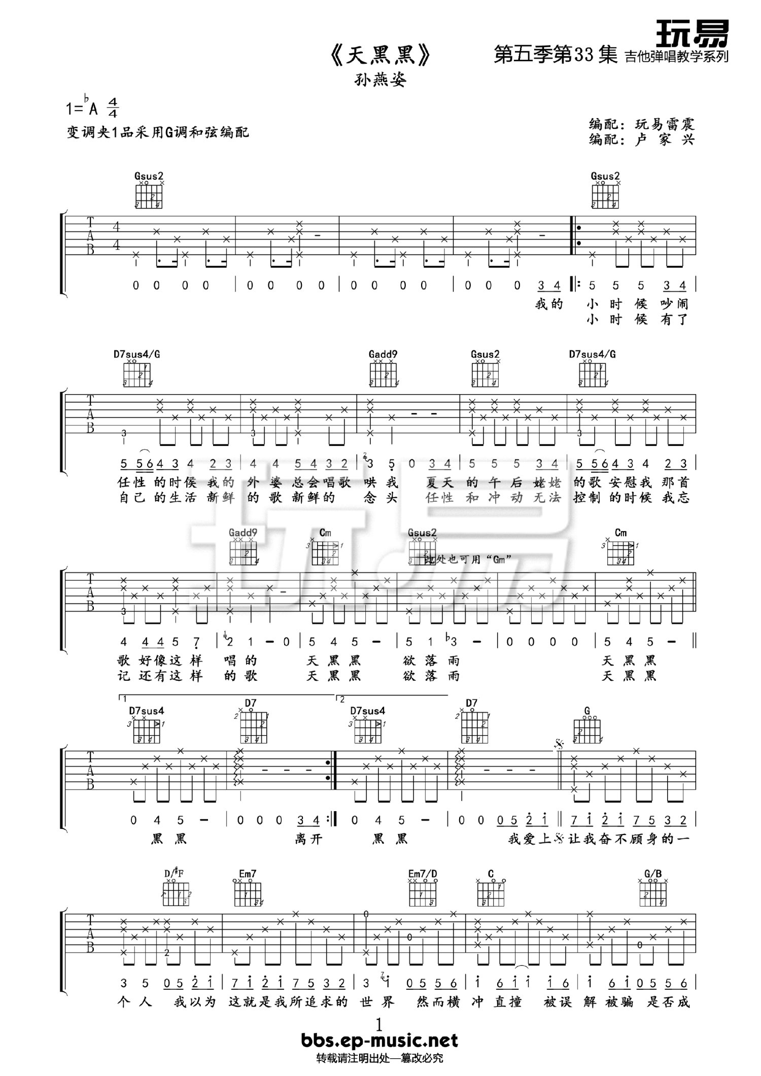 曲谱介绍: 孙燕姿《天黑黑》吉他谱_G调吉他弹唱谱