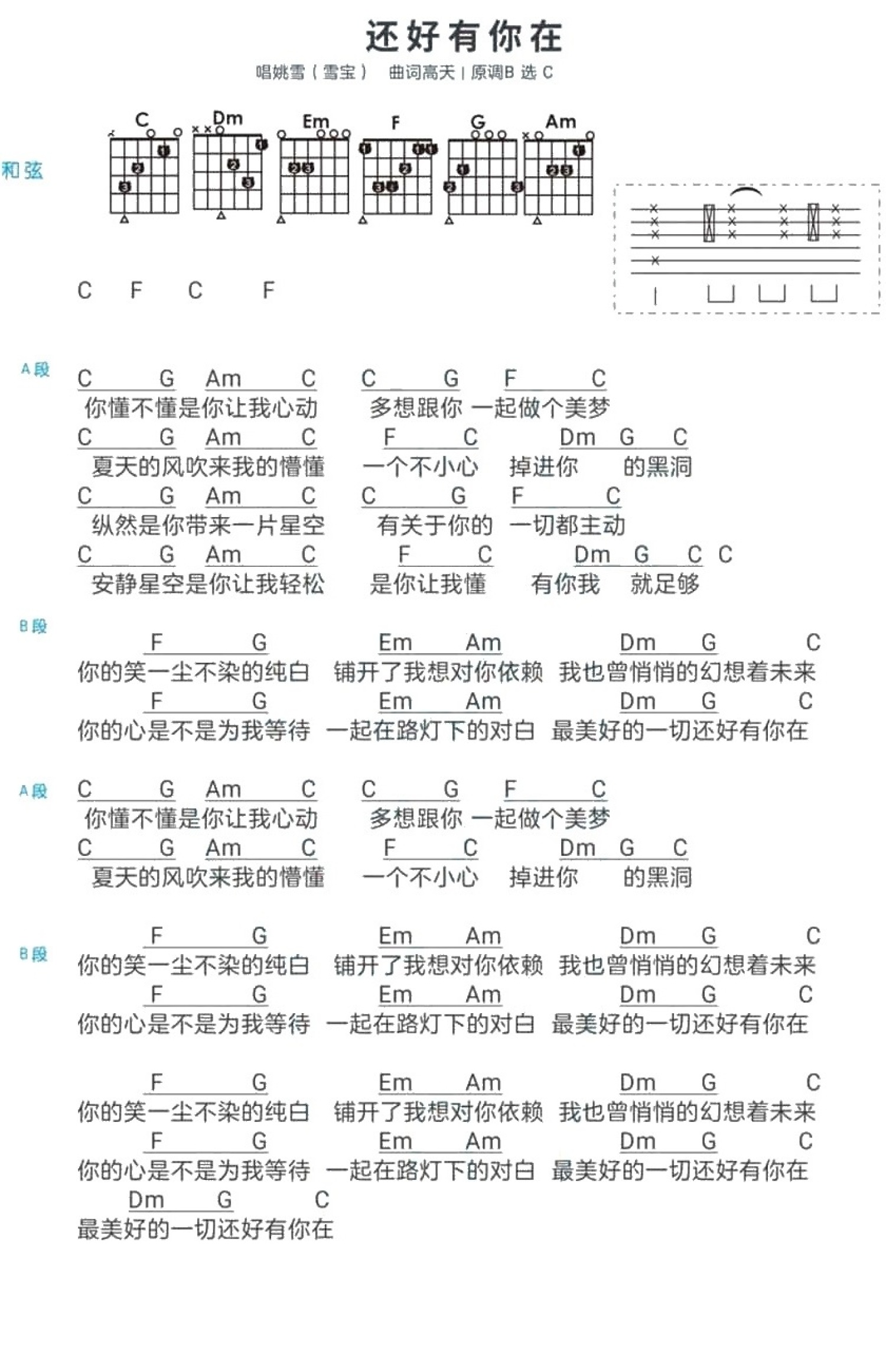 还好有你在吉他谱 - 姚雪 - C调吉他弹唱谱 - 和弦谱