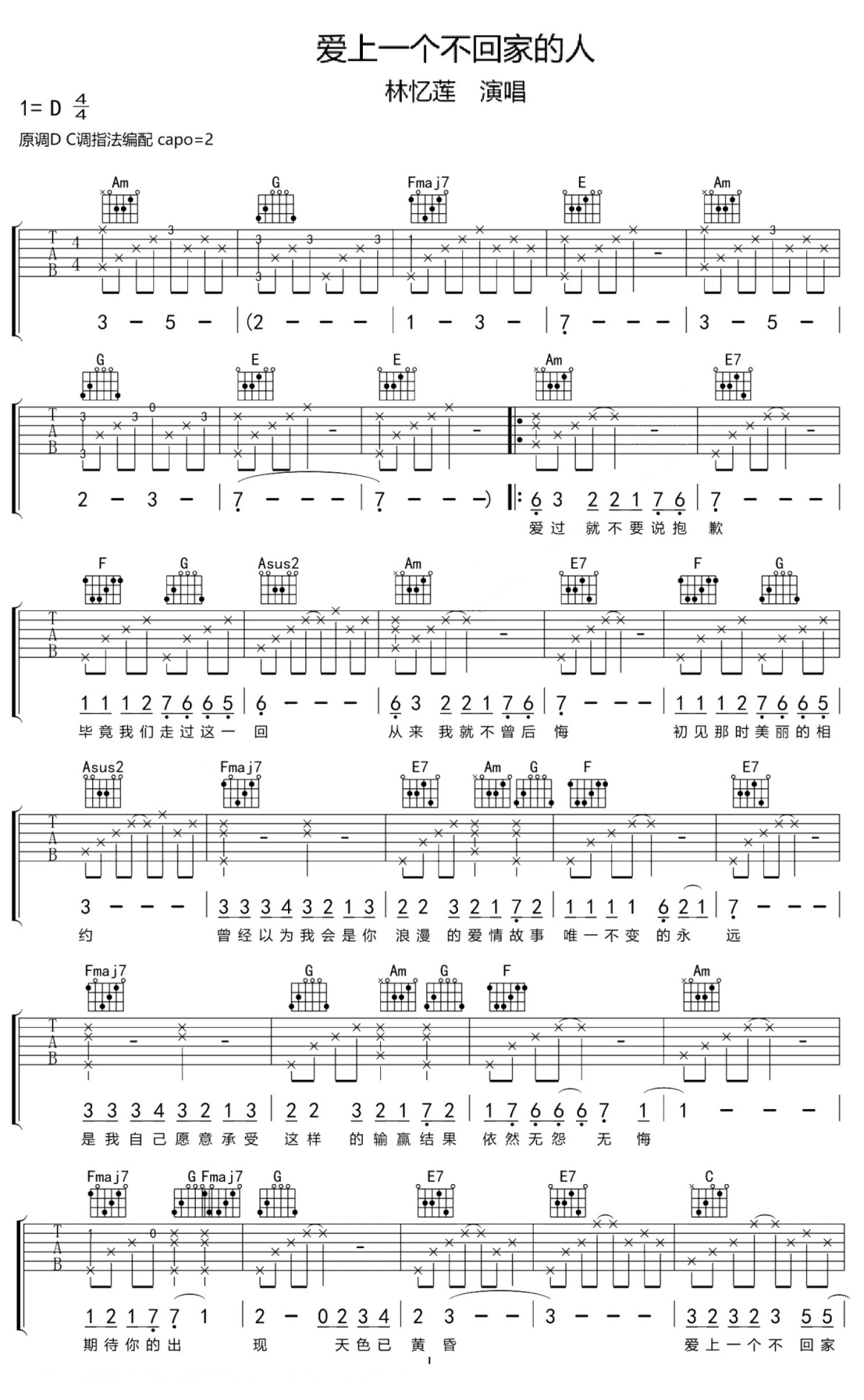 爱上一个不回家的人吉他谱 - 林忆莲 - C调吉他弹唱谱