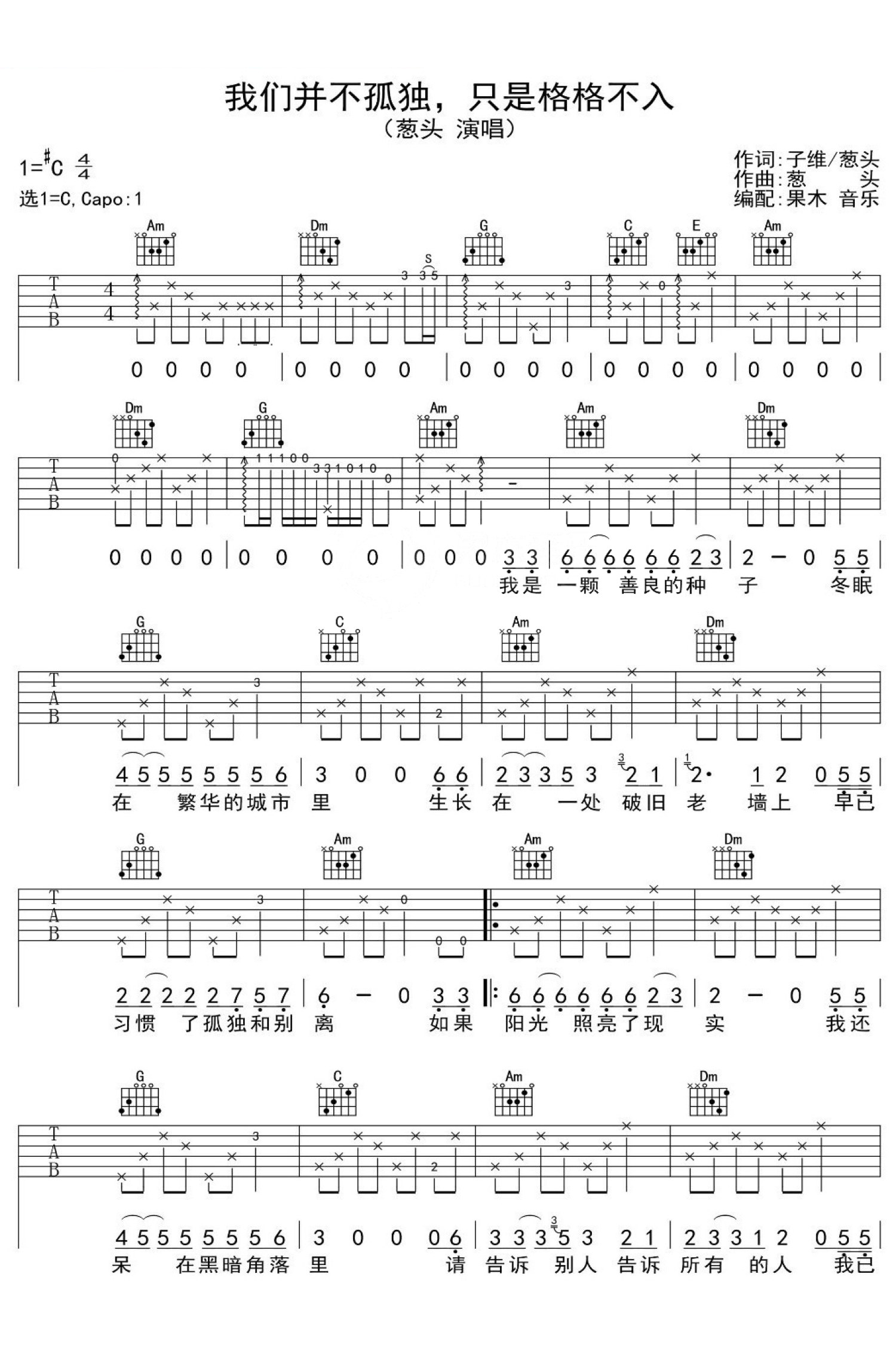 曲谱介绍: 葱头《我们并不孤独只是格格不入》吉他谱_C调吉他弹唱谱