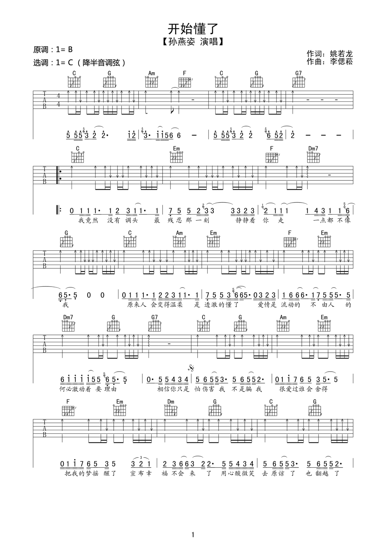曲谱介绍: 孙燕姿 开始懂了吉他谱C调扫弦版