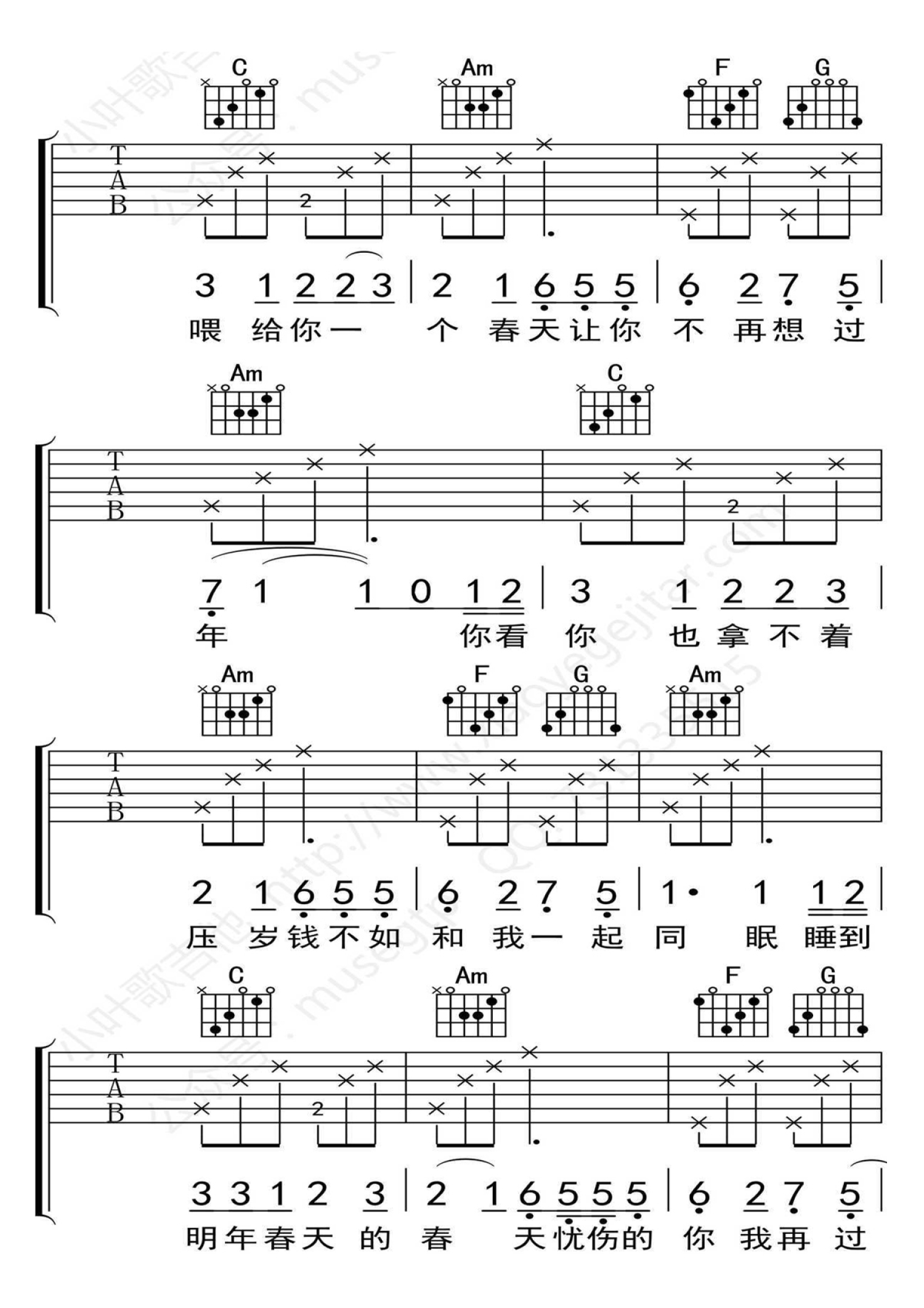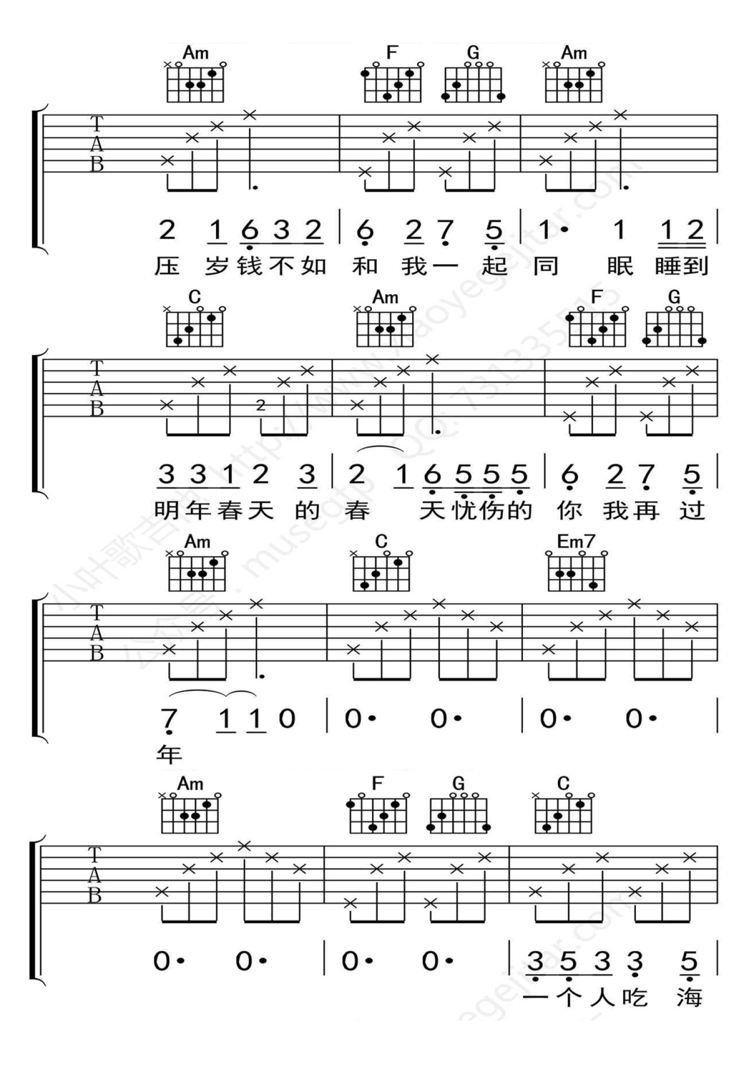 曲谱介绍: 作曲:沈以诚作词:沈以诚低烧长伴着我吃多少东西还不够“不允许太油腻”我的辛苦无人懂炸鸡店和鸡店都关门他们拒绝一切客人街上的风景毫无新春我不知往哪发蠢你看你也拿不着压岁钱不如和我一起同眠睡到明年春天的春天忧伤的你我再过年一个人吃海鲜鲍鱼还不及你的鲜“不允许太油腻”我的辛苦无人懂回家不一定有压岁钱不如立刻站我眼前我喂给你一个春天让你不再想过年你看你也拿不着压岁钱不如和我一起同眠睡到明年春天的春天忧伤的你我再过年