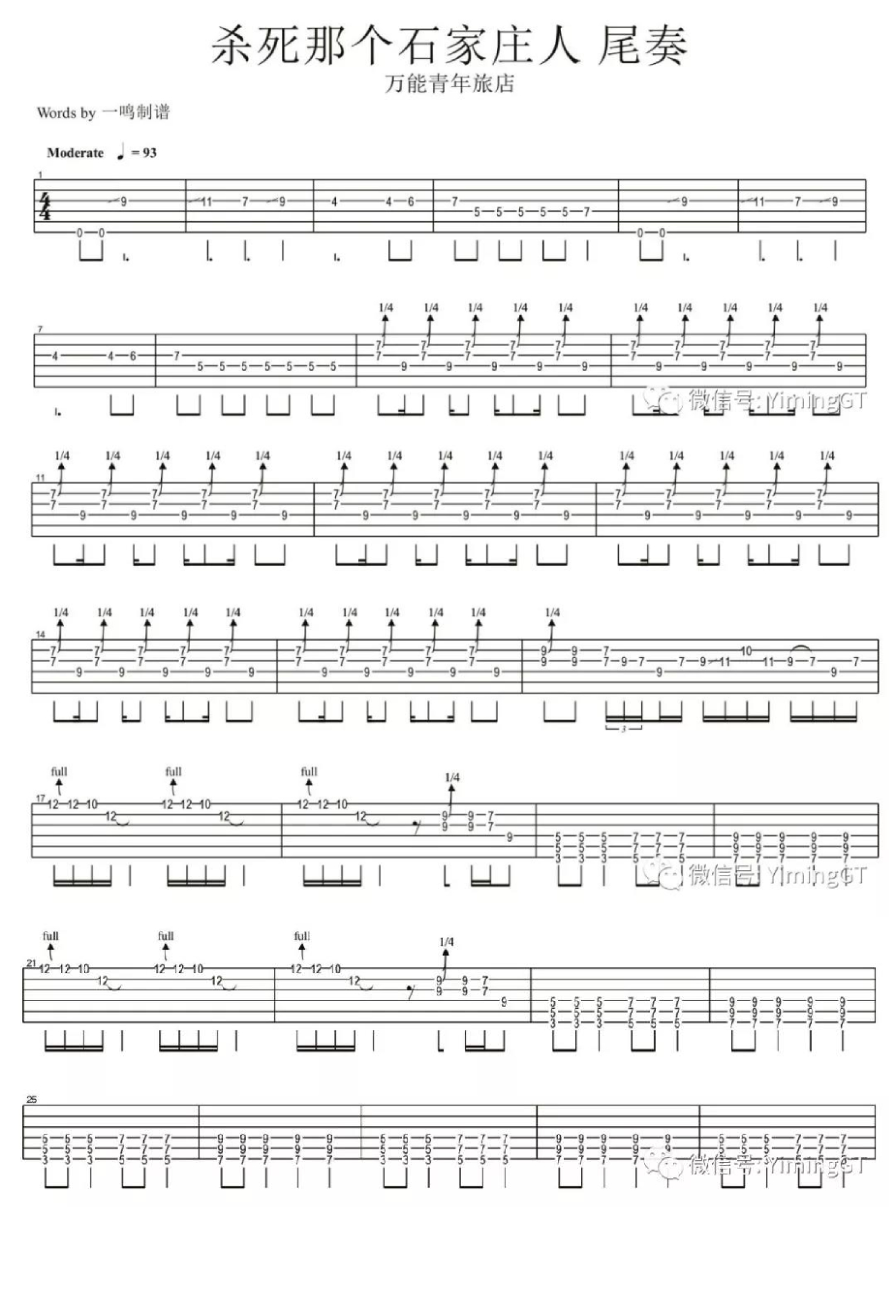 曲谱介绍: 万能青年旅店《杀死那个石家庄人》吉他谱_电吉他谱